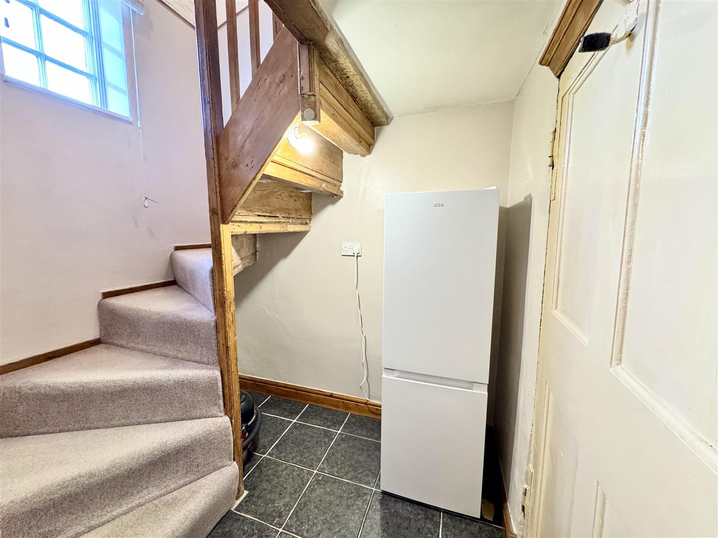 Positioned to the rear of the property, this modern kitchen is fitted with a range of wooden wall and base units, contrasting roll top work surfaces, tiled splash backs and a stainless steel sink and drainer with mixer tap over. Integrated appliances include an electric oven, four ring electric hob with extractor fan over. plumbing for a washing machine, a rear facing window overlooks the rear lane and tiled flooring completes the room. A door leads to the inner lobby which has space for a fridge freezer, a double power socket and stairs leading to the first floor.
