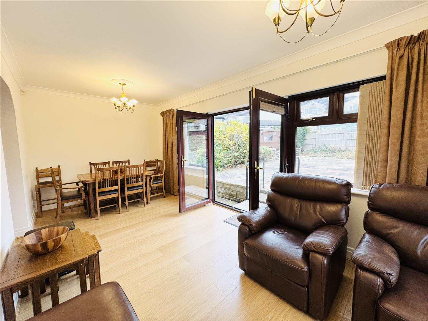 Located to the front of the property and enjoying stunning views over the countryside towards Emley Moor Mast from its generous bay window, this spacious lounge has decorative coving, ceiling roses complete with brass light fittings and matching wall light which illuminate the room beautifully. An electric fire sits on a polished cream marble surround creating a lovely focal point in the room and there is ample space to accommodate items of lounge furniture. A set of double doors with glazed panels open to the hallway.