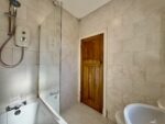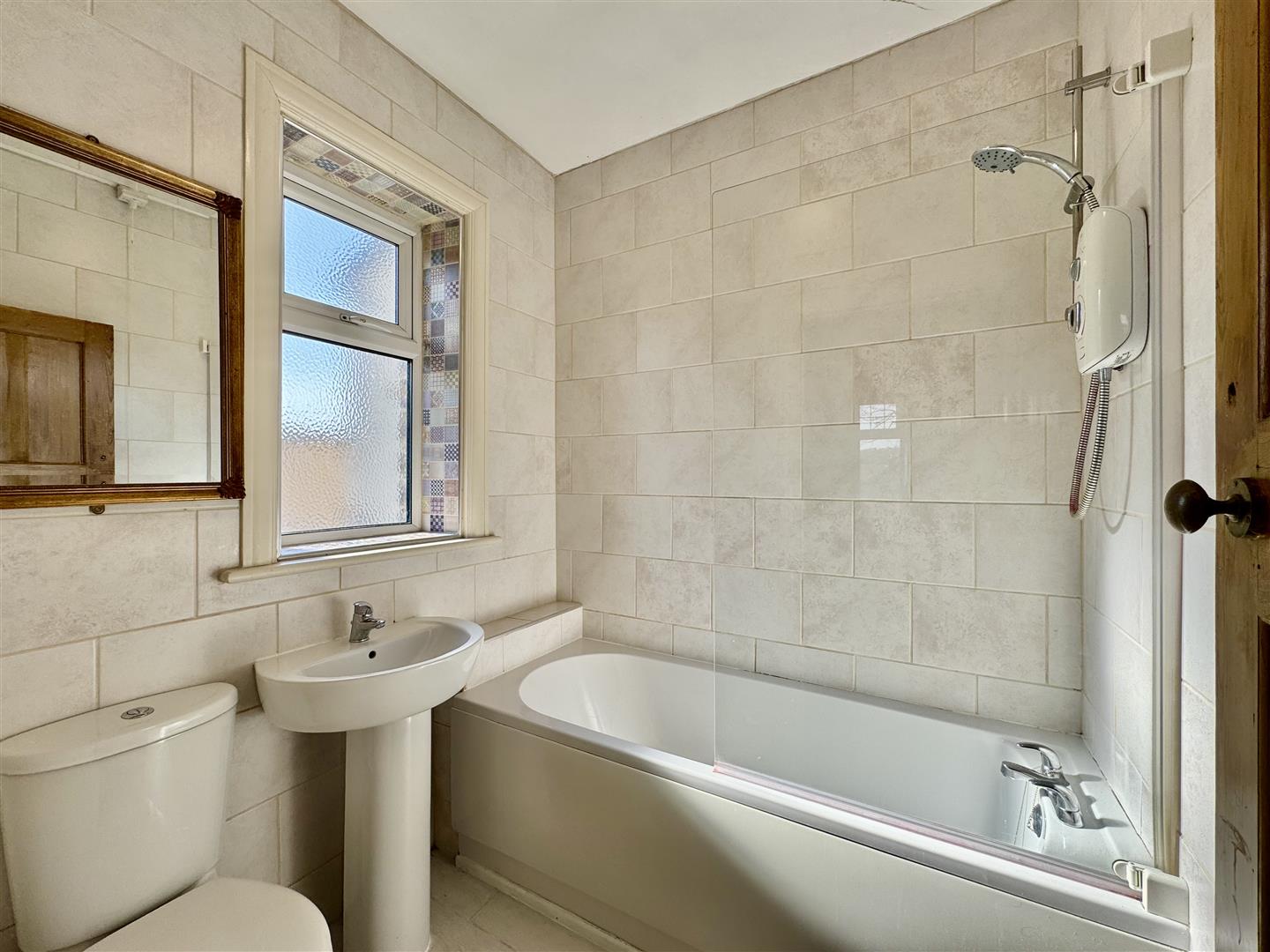 This modern bathroom is fitted with a white three-piece suite, including a bath with an electric shower over, a pedestal hand wash basin and a low level W.C. The room is fully tiled to the walls, has complimentary tile flooring underfoot and an obscure glazed window allowing light to flow through the space. A door leads to landing.