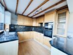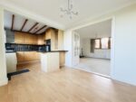 Spanning the rear of the property with two windows looking out into the back garden and a stable style door which leads out there too, this fabulous dining kitchen has distinct areas for preparing food and dining. The kitchen area is fitted with a range of timber base and wall units with dark laminate worktops, black tiled splashbacks and a one and a half bowl stainless steel sink with mixer tap over. Cooking facilities comprise of a gas four burner hob with a concealed extractor fan over and a double electric fan oven. There is space and plumbing for both a washing machine and a dishwasher. Beech effect laminate flooring runs under foot and a spotlight bar nestled between fake beams to the ceiling lights up the room. To one end of the room is a good sized dining area with a central chrome light fitting over the table. A set of double doors opens into the lounge.