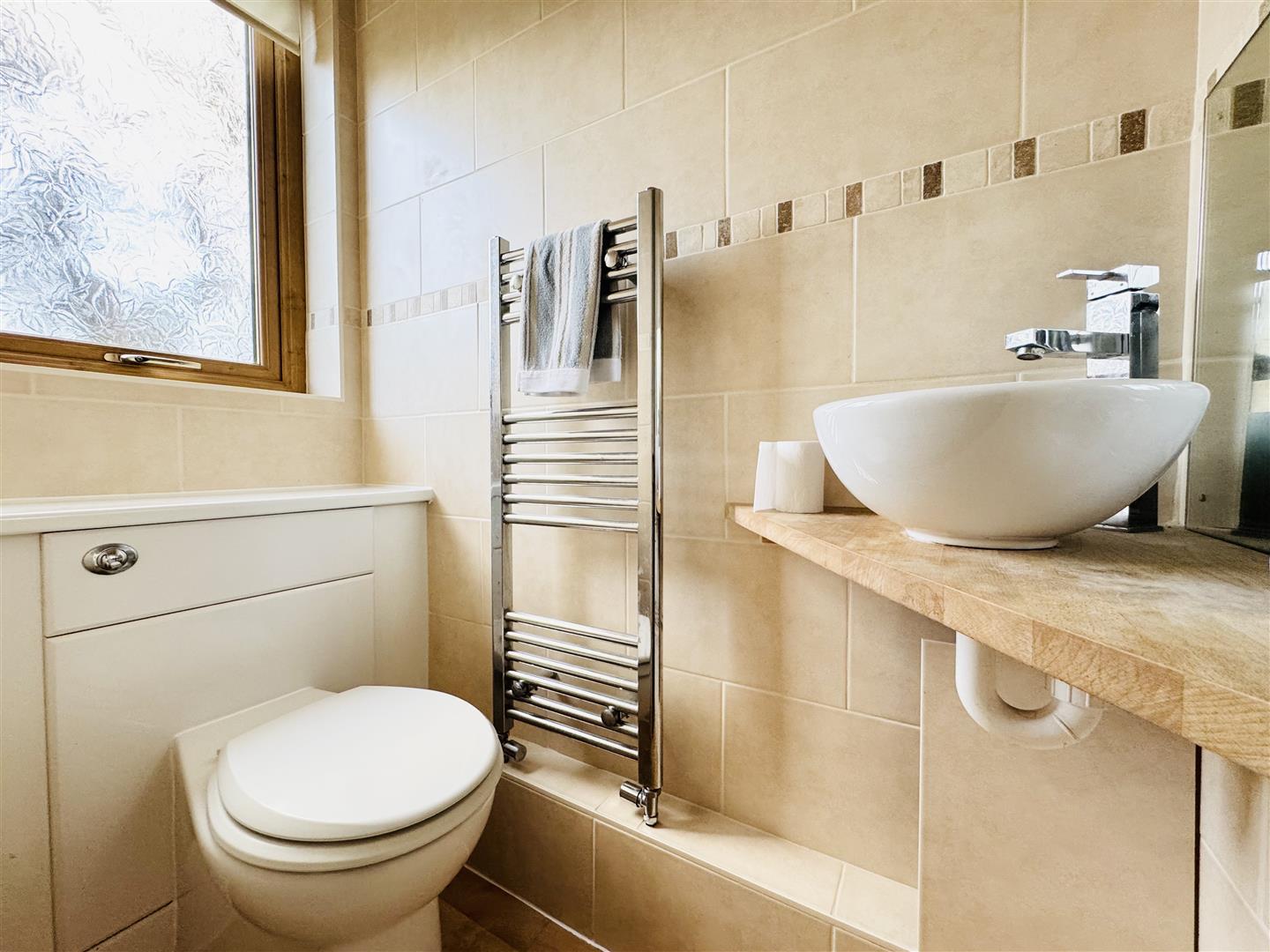 Handily positioned just inside the front door of the property, this guest WC is nicely presented and fitted with a concealed cistern WC alongside an attractive bowl style hand wash basin which sits on a timber corner shelf. The room is fully tiled with beige tiles with a decorative mosaic border. Wood effect vinyl flooring runs under foot and a chrome heated towel radiator completes the room. An obscure window allows natural light to enter and a door leads to the entrance hallway.