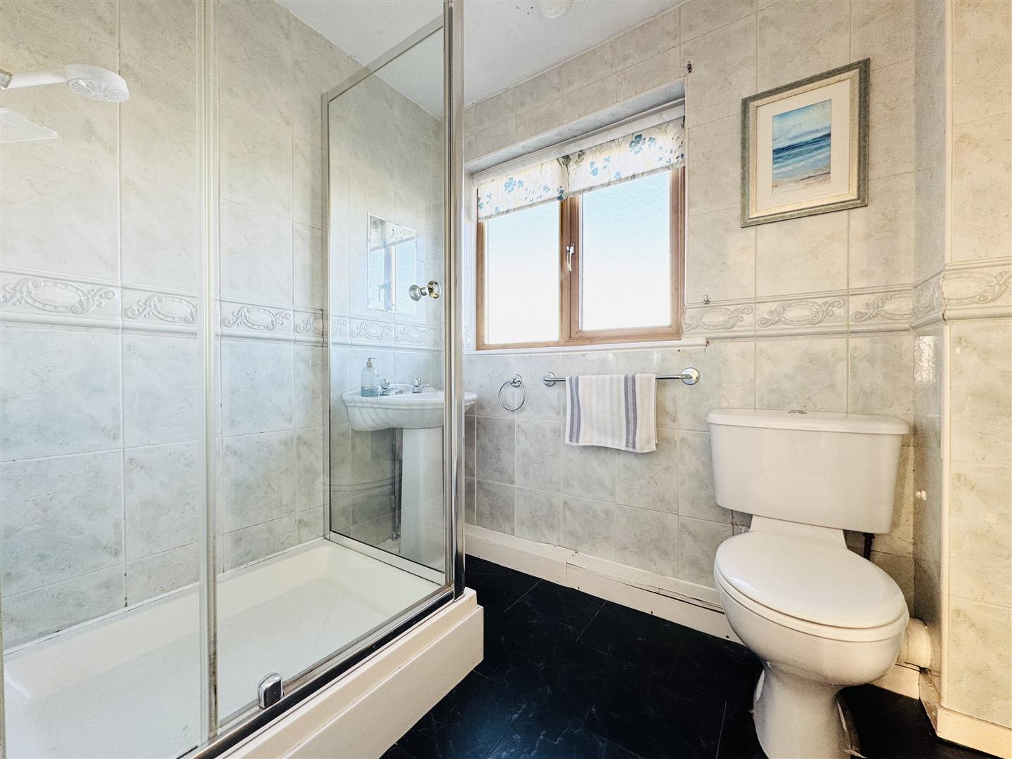 This modern shower room is fitted with a white suite comprising of a low-level WC alongside a shell design a pedestal hand wash basin with chrome taps and a large step in shower enclosure with an electric shower. The room is fully tiled with a combination of subtle green marble effect tiles with a decorative border. Black tile effect vinyl flooring runs underfoot. An obscure window allows natural light to enter and a door leads to the landing.