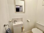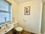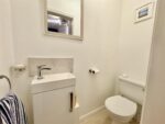 Useful ground floor cloaks having a two piece suite in white consisting of a vanity wash basin with storage and mixer tap and low level WC. There is tiling to splash areas, an extractor fan, a wall mounted radiator and vinyl flooring.