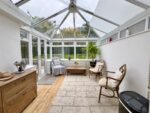 Fantastic addition, this substantial orangery has many potential uses and is flooded with natural light via the double glazed window and roof. Very usable all year round courtesy of the wall mounted radiator, the wood flooring flows beautifully from the kitchen area and there is a touch of class with the ceiling fan and light. French doors take you to the garden and there is added privacy with one side having screening to the window and roof. There is a curtain that can be drawn across the gap, closing off the kitchen to the orangery if required.