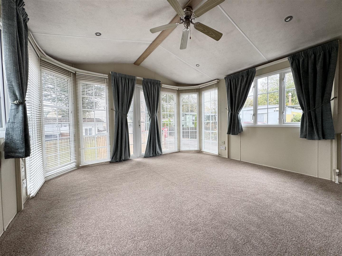 Light and airy courtesy of glazing to all sides, this lovely lounge space has an electric fire as a focal point, carpet underfoot and a ceiling fan to the ceiling. Openings lead into the dining kitchen.