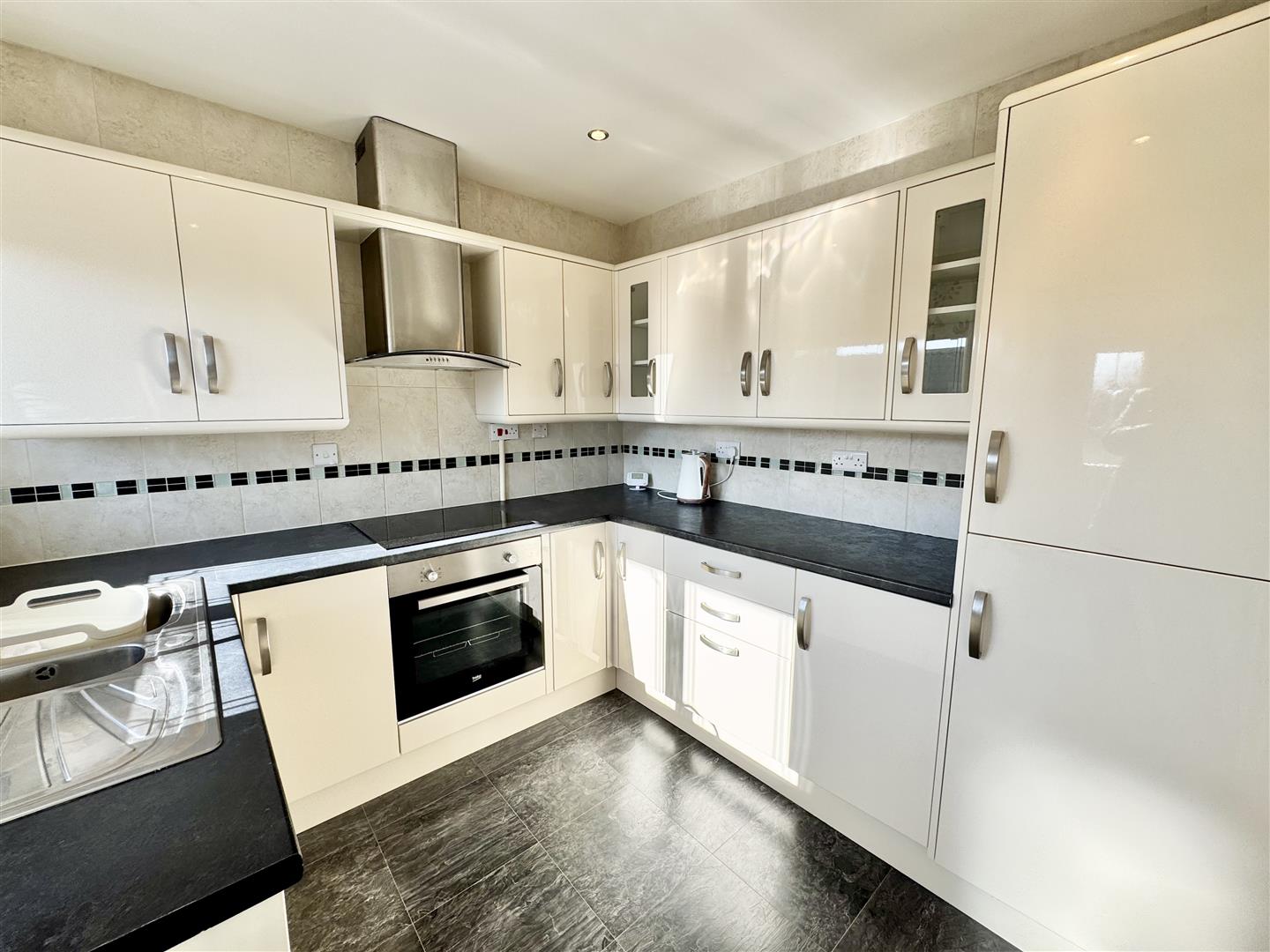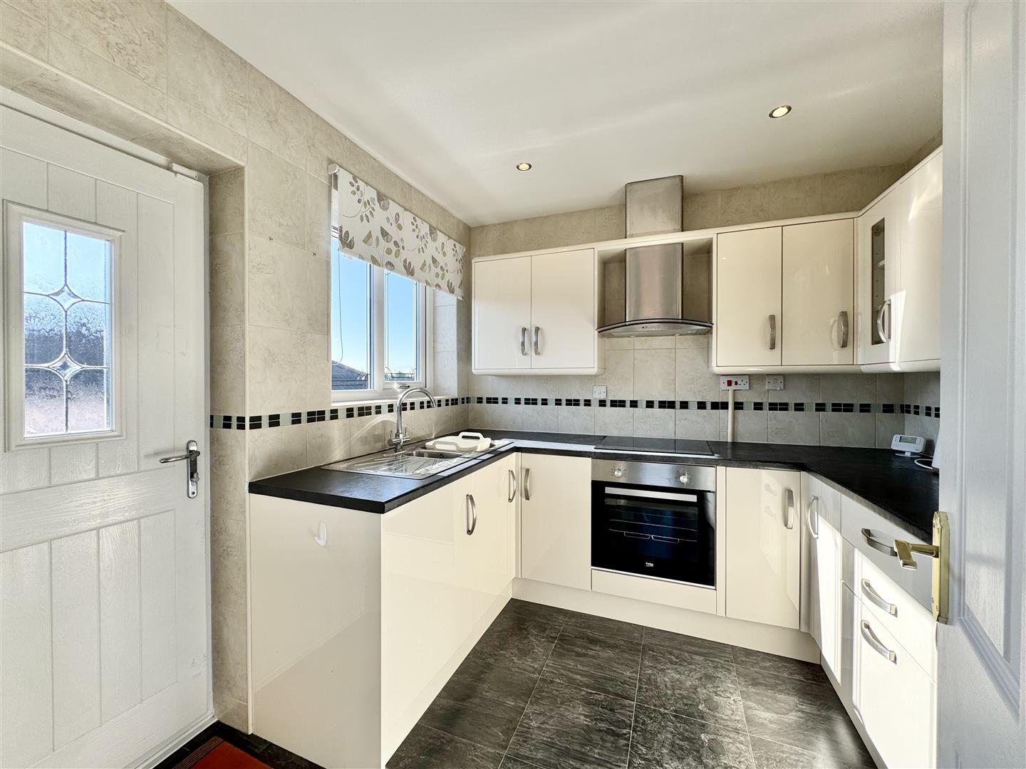 Situated off the entrance lobby, this separate kitchen has a good range of wall and base units with a cream finish, complimentary rolled worktops, inset one and a half bowl stainless steel sink with mixer tap with the walls tiled to full height. Integral appliances include an electric oven, ceramic hob with curved glass and stainless steel extractor hood over, upright fridge freezer and washing machine. A double glazed window brings in natural light, there is vinyl tiled flooring, inset ceiling spotlights and a pantry cupboard. An internal door leads to the lobby.