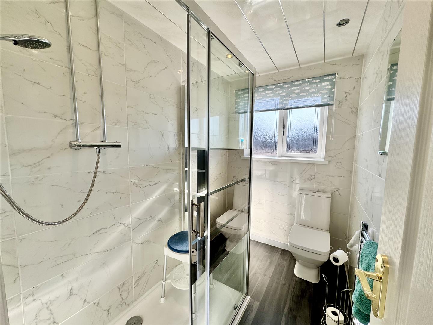 Stylish, modern shower room having a three piece suite in white consisting of a double shower enclosure the thermostatic shower and sliding doors, vanity wash basin with mixer tap and storage under and twin flush low level WC. Tiling on the walls is to full height, there is laminate flooring, inset ceiling lighting in the low maintenance ceiling and a chrome towel radiator. A double glazed window with obscure glass beings in natural light and an internal door leads to the inner lobby.
