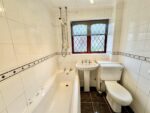 House bathroom on the first floor with a three piece suite in white consisting of a panel bath with thermostatic shower over, pedestal wash basin and a low level WC. The walls are tiled to full height, there is a ladder towel radiator, ceiling spotlights and a tiled floor. A double glazed window with obscure glass brings in natural light and an internal door leads to the landing.