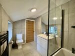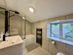 Handily positioned, this room has a low level W.C and a large vanity hand wash basin with mixer tap, anthracite towel radiator and tile flooring underfoot. A door opens to bedroom one.