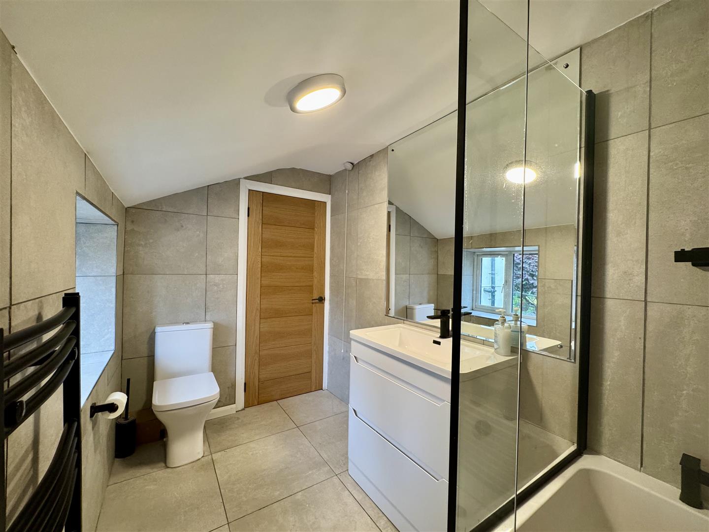The stylish family bathroom comprises of a bath with waterfall shower over and glass screen, a vanity hand wash basin with mixer tap, low level W.C and an anthracite towel radiator. The room is fully tiled with complimentary tile flooring underfoot, has a rear facing window, space for freestanding storage if desired and a door leads on to the landing.