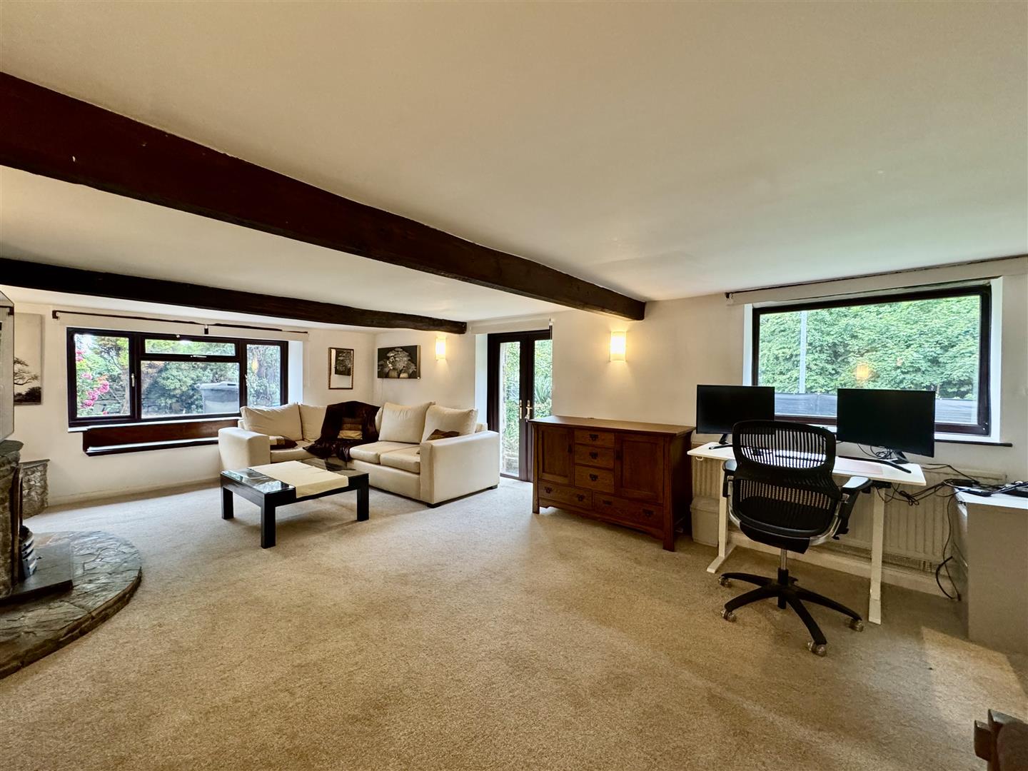 An exceptionally spacious dual aspect living room bathed in natural light with a set of patio doors that open directly to the garden. This impressive reception space offers ample room for both relaxing and entertaining, with generous proportions that will easily accommodate a range of freestanding furniture. A curved stone fireplace with shelving houses a coal effect gas fire and characterful beams adorn the ceiling. A door opens to the entrance hall.