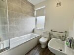 Stylish en suite bathroom having a three piece suite in white consisting of a panel bath with thermostatic shower over and bi-fold screen, pedestal wash basin with mixer tap and twin flush low level WC, There is vinyl flooring underfoot, a church style radiator with attached chrome towel rail and ceiling spotlights. The boiler is located in the useful bulkhead storage area and natural light is brought in via the frosted double glazed window.
