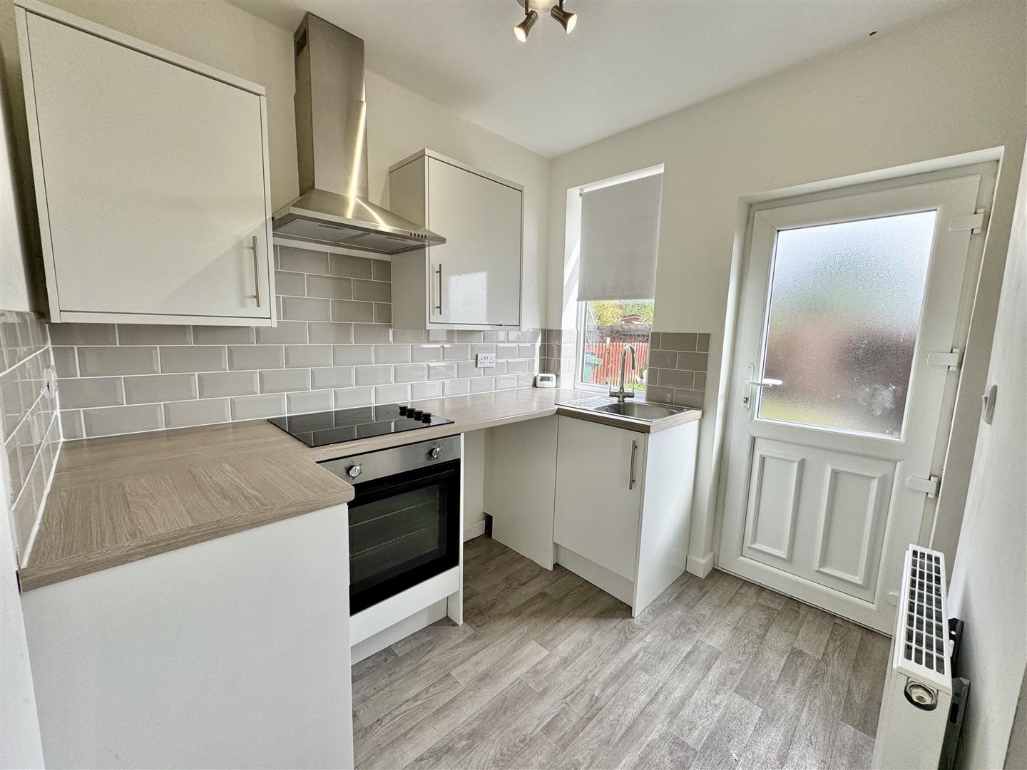 A very modern kitchen, situated at the rear of the property and having a good range of wall and bae units with a high gloss white finish, complimentary rolled worktops, stainless steel sink with mixer tap and tiled splashbacks. Integrated appliances come in the form of an electric oven, ceramic hob and stainless steel extractor hood. There is plumbing for a washing machine, space for a fridge freezer, vinyl flooring and wall mounted radiator. A carpet staircase takes you to the first floor, natural light comes from the double glazed window which overlooks the rear patio, there are ceiling spotlights and a useful storage cupboard. A double glazed uPVC door leads to the rear and an internal doorway takes you to the lounge.