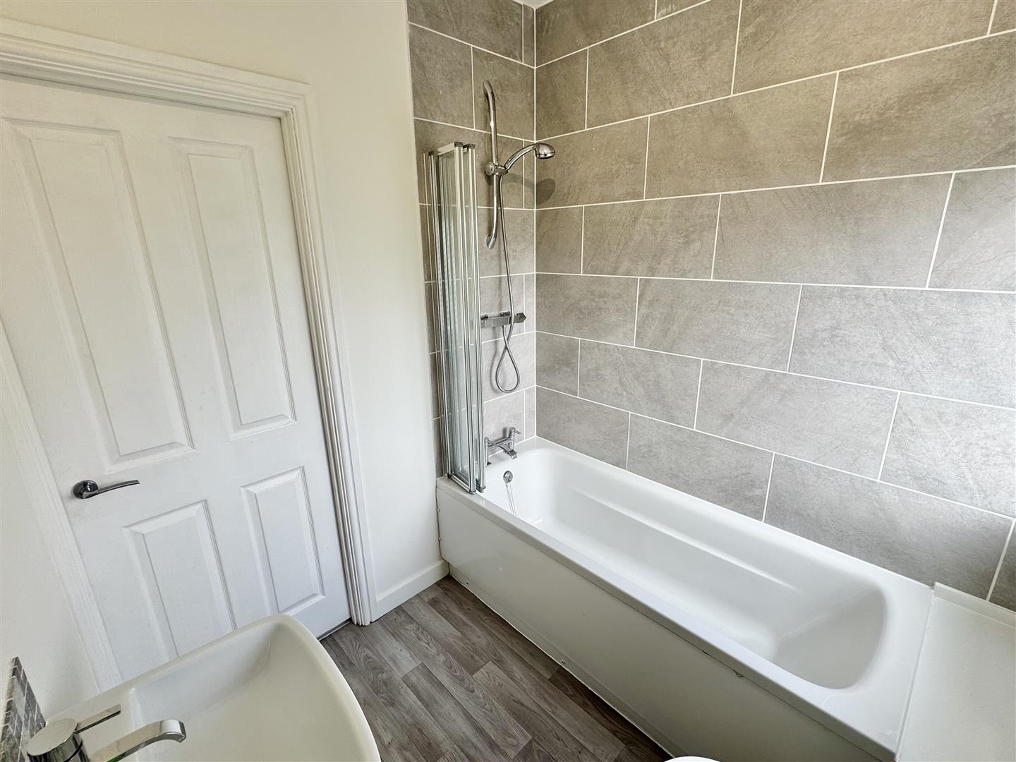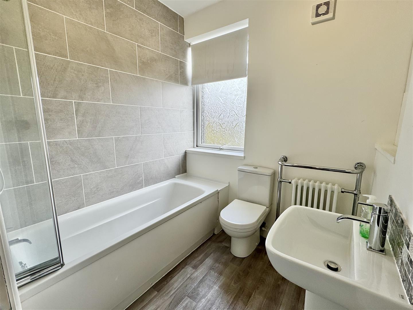 Stylish en suite bathroom having a three piece suite in white consisting of a panel bath with thermostatic shower over and bi-fold screen, pedestal wash basin with mixer tap and twin flush low level WC, There is vinyl flooring underfoot, a church style radiator with attached chrome towel rail and ceiling spotlights. The boiler is located in the useful bulkhead storage area and natural light is brought in via the frosted double glazed window.