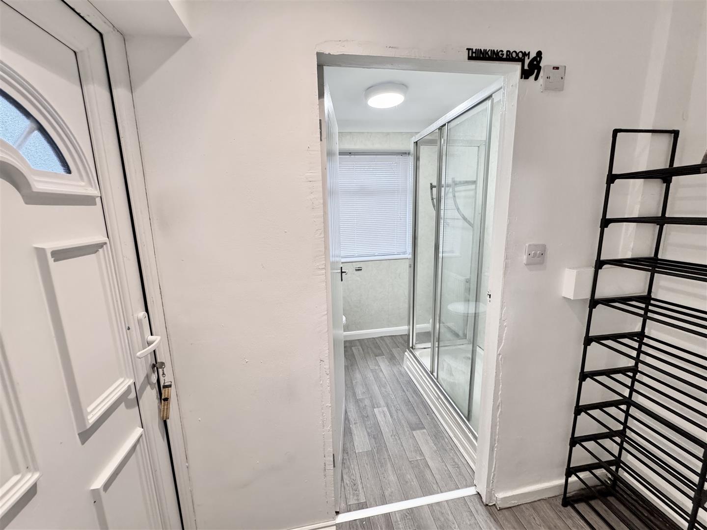 Situated between the kitchen and the ground floor shower room, separating the two spaces, there is vinyl flooring, a wall mounted radiator and uPVC door leading to the rear patio garden. An internal door leads to the shower room.