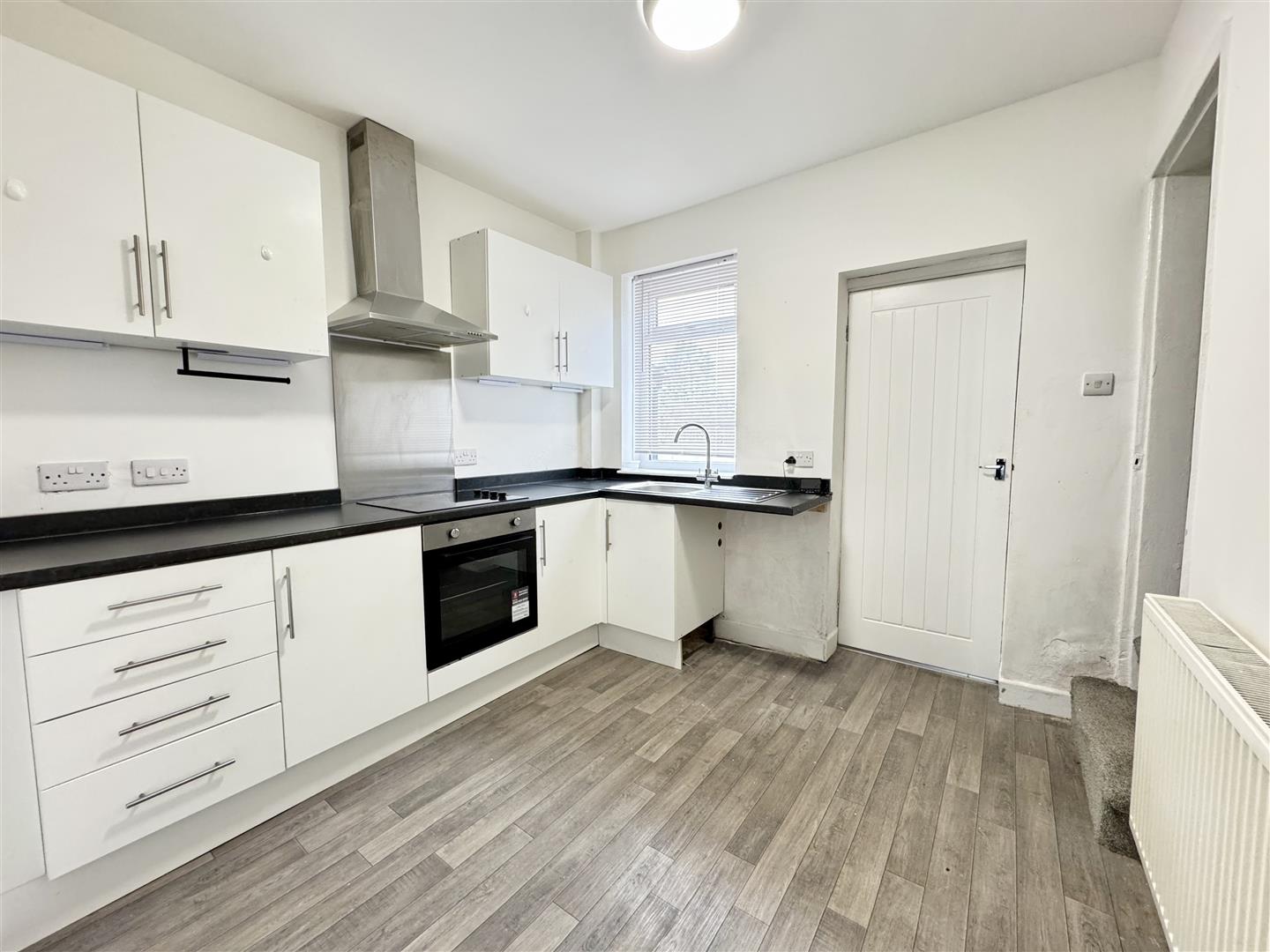Situated towards the rear of the property with the double glazed window giving a view of the patio garden, the kitchen consists of a range of white wall and base units, complimentary rolled worktops, matching splashbacks and stainless steel sink with mixer tap. Integral appliances include an electric oven , ceramic hob with stainless steel extractor hood over plus there is plumbing for a washing machine and space for an fridge freezer. Vinyl flooring runs underfoot, there is ceiling lighting, a convenient understairs cupboard and a wall mounted radiator. An internal door leads to the rear lobby.
