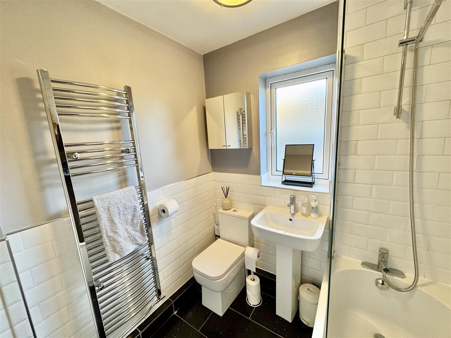 Convenient feature, accessed off the landing and accessible for both first floor bedrooms. Having a two piece suite consisting of a wall mounted vanity wash basin with storage and mixer tap and a twin flush low level WC. There is a double glazed window bringing in natural light, tiling to splash areas, inset ceiling spotlights, tiled flooring and an upright designer towel radiator. An internal door leads to the landing.