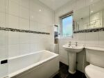 This modern bathroom is fully tiled and fitted with a three piece white suite comprising of a low level W.C, pedestal hand wash basin and a bath with waterfall shower over. A rear obscure window allows natural light to flood the room, contrasting tile flooring flows underfoot and a door leads onto the landing.