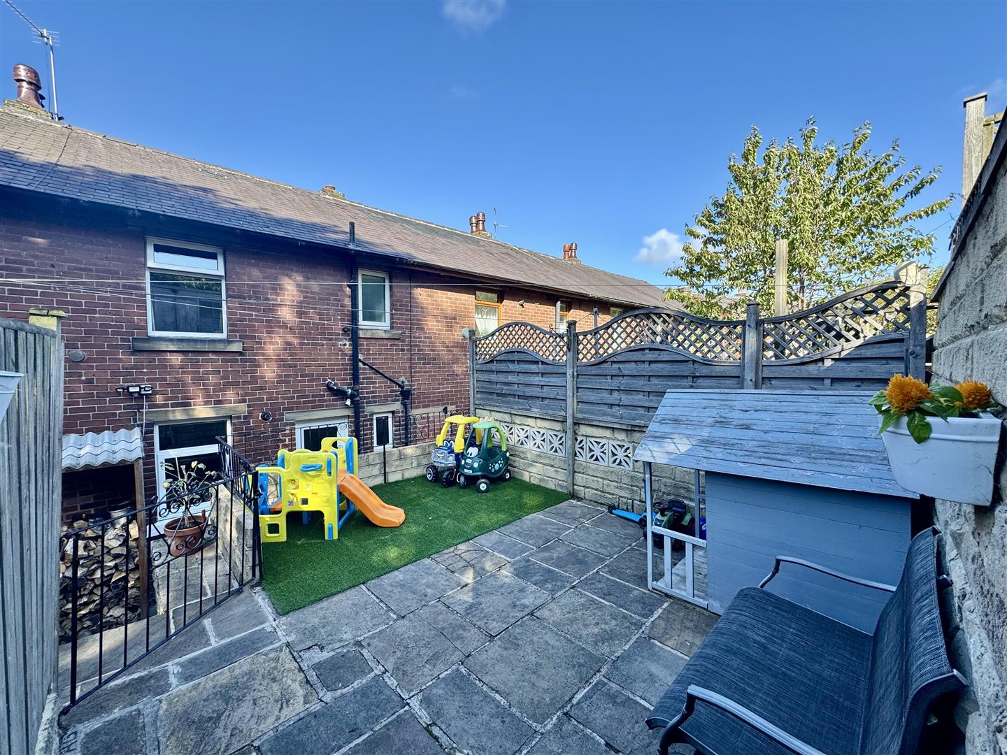 To the rear of the property via shared access is a patio area. Stone steps ascend to a patio area with artificial grass ideal for outdoor dining, barbeques and with space for garden furniture. Another set of steps lead to another patio area and then to a space with a timber outbuilding offering pleasant views back to the house.