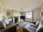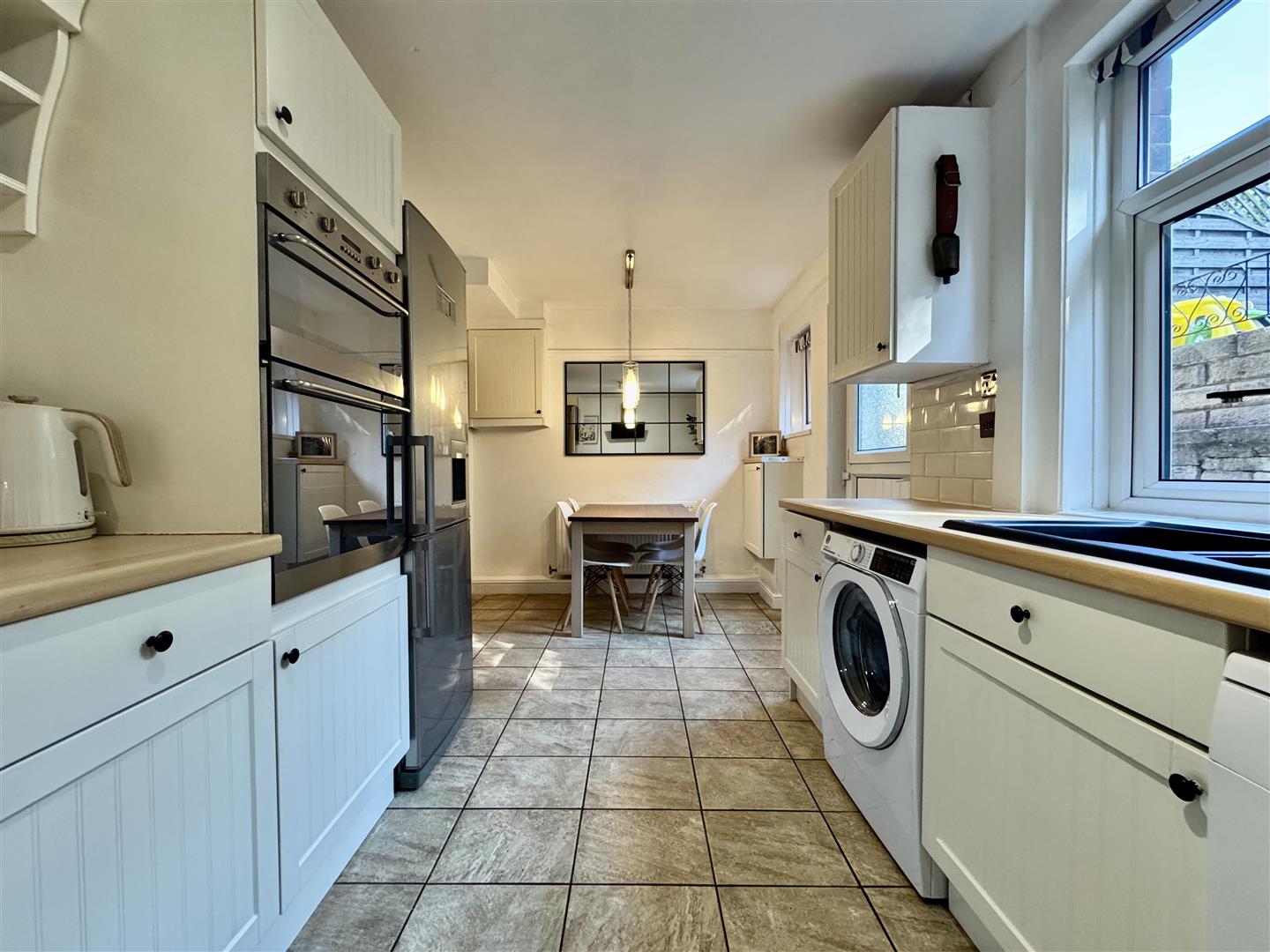 Spanning the rear of the property, this attractive dining kitchen has two windows which flood the space with natural light. The kitchen area comprises of cream wall and base units, contrasting work surfaces and a composite sink and drainer with mixer tap over. Integrated appliances include an electric oven, grill and a five ring gas hob with extractor over. There is space for a freestanding fridge freezer and plumbing for a washing machine and dishwasher. To the side of the kitchen is room for a dining table and chairs. There is a handy understairs cupboard which has space for household items. Tile flooring throughout completes the look. An external door opens to the rear patio and a door leads back through to the living room.