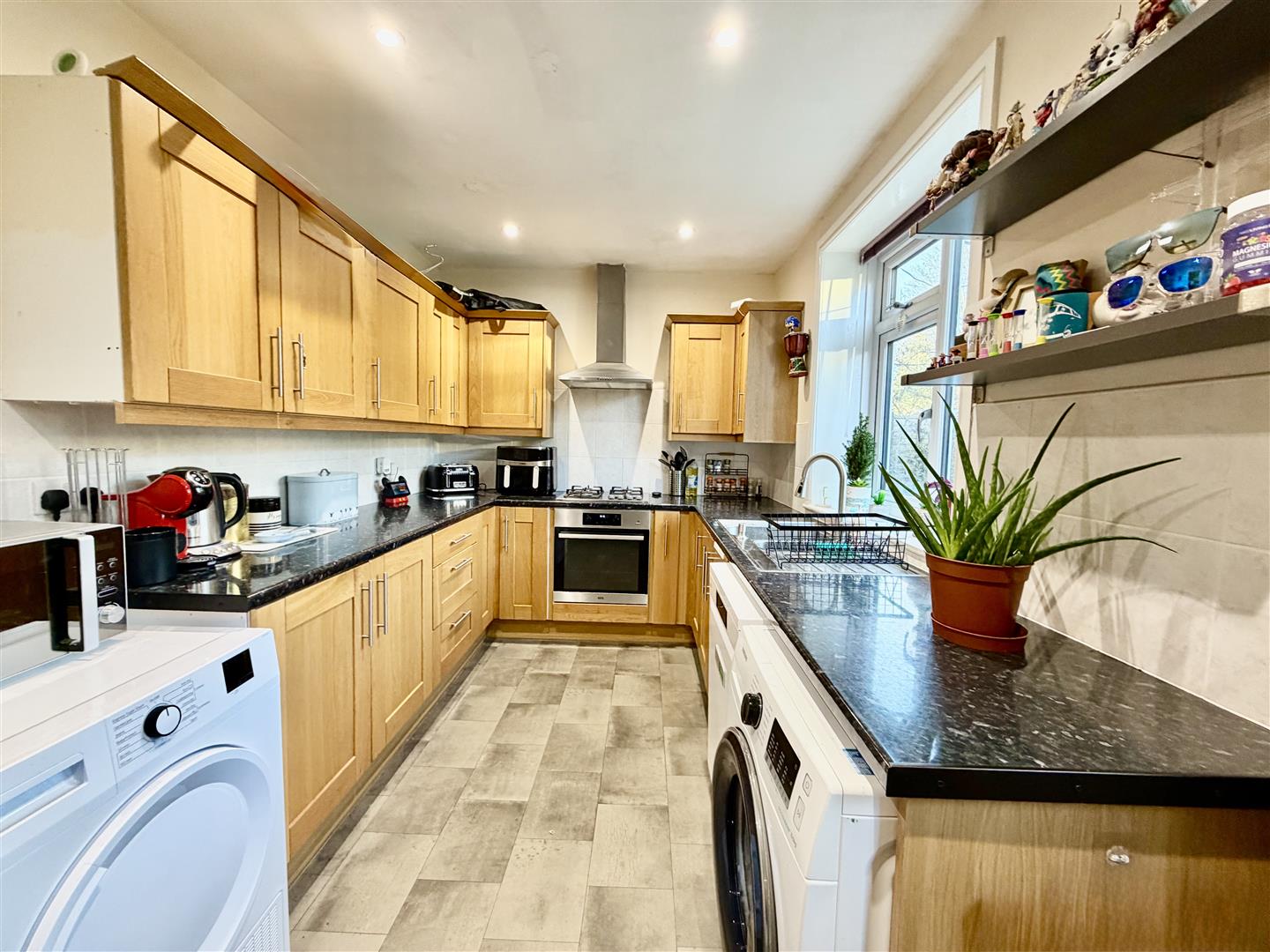 A most spacious dining kitchen spanning the full rear width of the property being fitted with a comprehensive range of shaker style wall and base cupboard units with contrasting granite effect work surfaces, inset single drainer sink unit, integrated electric oven, four ring gas hob and stainless steel extractor hood over, plumbing for washing machine, recessed spotlighting to the ceiling, useful pantry recess affording generous storage, space for dining table, two Upvc double glazed rear windows and door giving access to the rear garden.