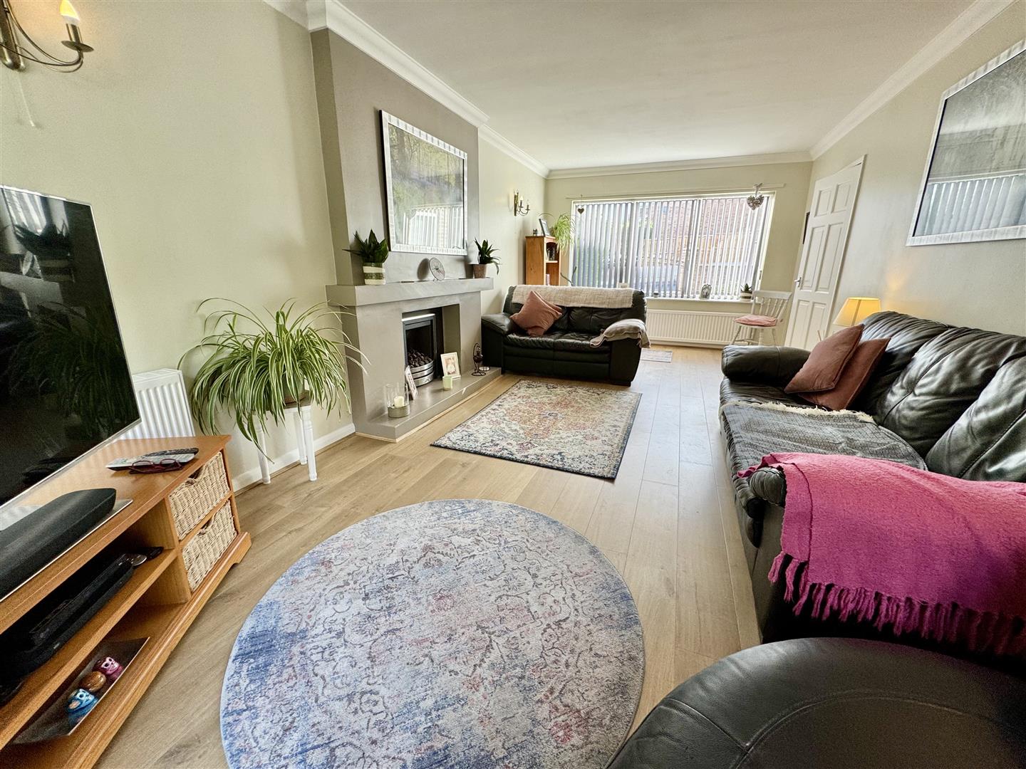 Generous sized living room, bathed in natural light from the double glazed window to the front and patio doors to the rear, which take you to the patio and garden. The focal point of the room is the gas fire, there is laminate flooring, wall lights and two double radiators. There is coving to the ceiling and an internal door leads to the hallway.