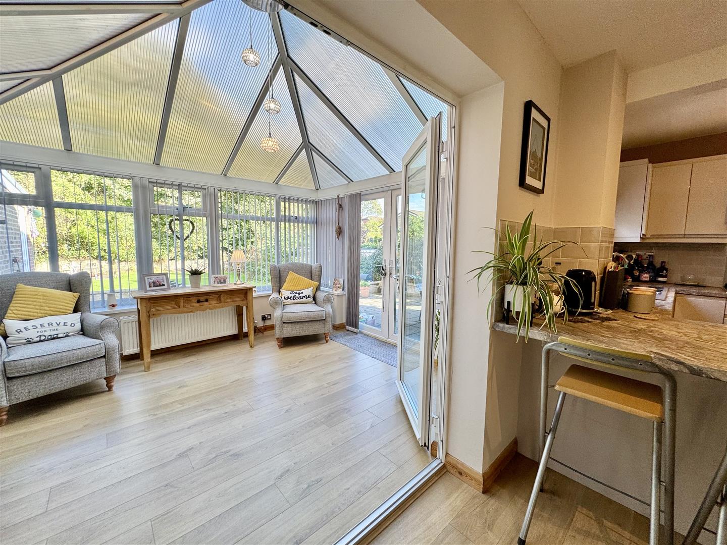 Fantastic space with the kitchen part having a great range of high gloss light grey wall and base units, complimentary marble effect worktops, inset one and a half bowl composite sink with mixer tap and tiled splashbacks. Integral appliances come in the form of an eye level double oven, five ring gas hob with extractor fan over and dishwasher plus there vis space for an upright fridge freezer. There is a matching breakfast bar, laminate flooring runs underfoot and two ceiling spotlights. The double glazed window overlooking the garden beings in plenty of natural light, there is a wall mounted double radiator and there is sufficient space for a dining table and chairs. A double glazed door leads to the side and large double glazed French doors lead to the conservatory.