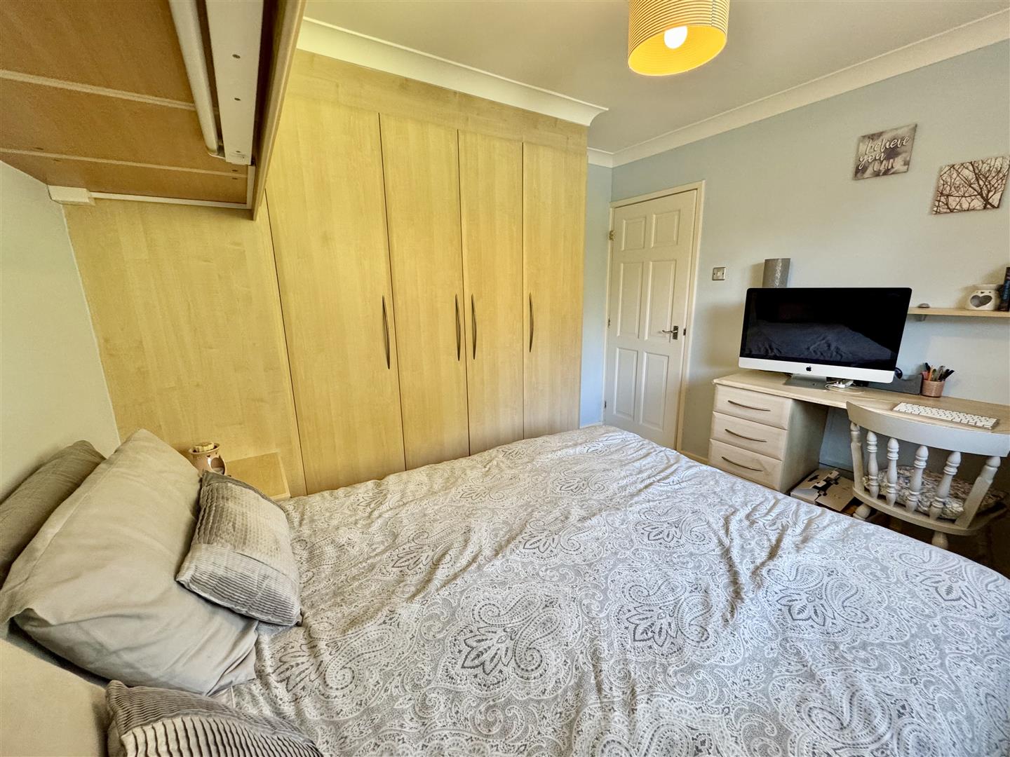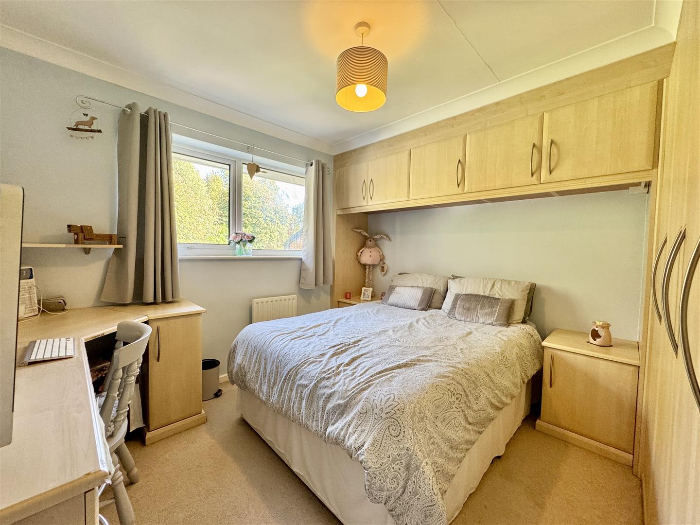Second double bedroom, again with a fantastic range of fitted wardrobes consisting of two double wardrobes, overhead storage, dressing table, drawers and bedside units. Located at the rear of the property, the double glazed window brings in natural light and provides excellent views of the garden. There is carpet flooring, a wall mounted radiator, pendant lighting and coving to the ceiling. An internal door leads to the hallway.