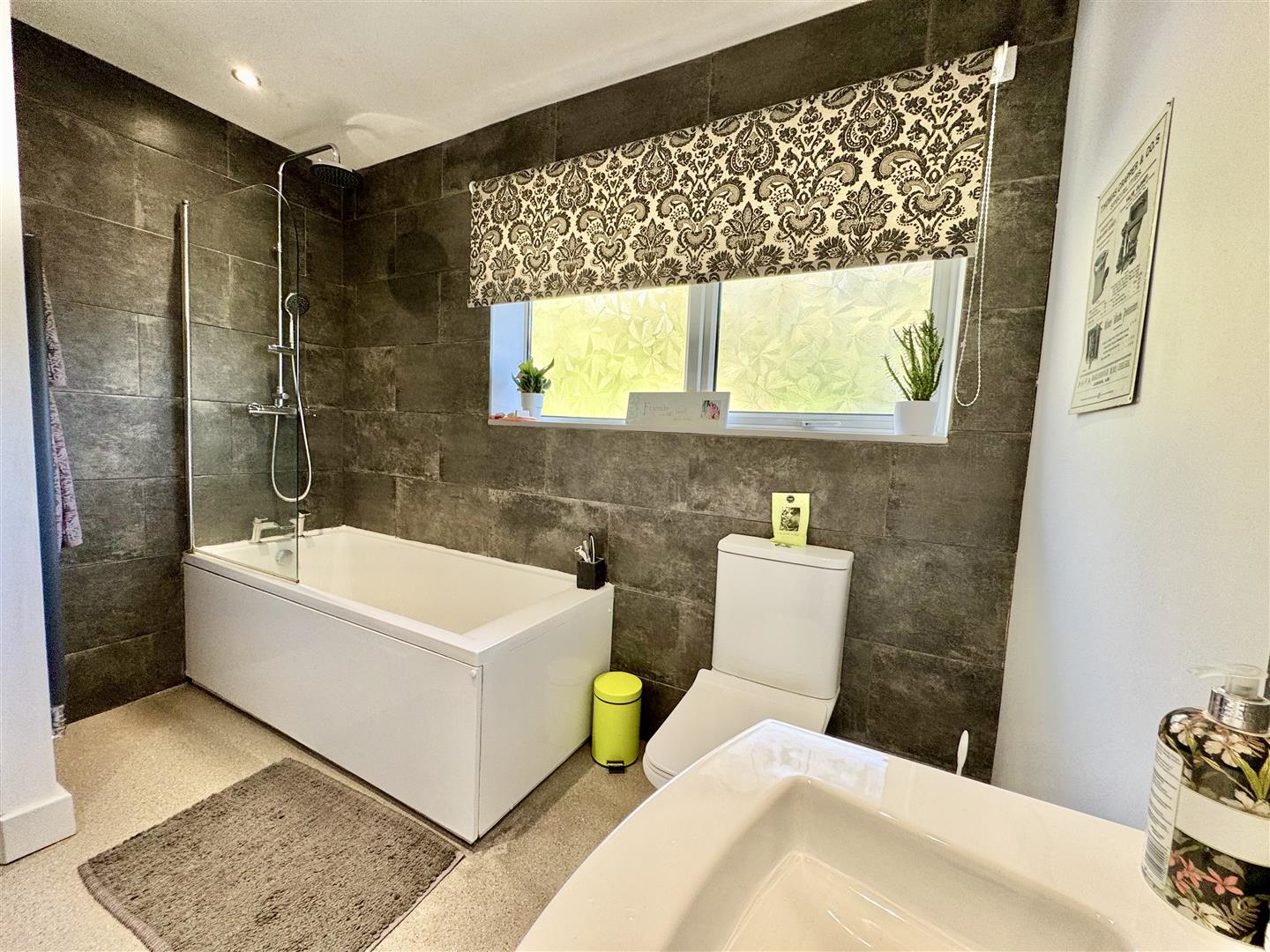 Stylish house bathroom having a three piece suite in white consisting of a panel bath with thermostatic rain shower over with separate hose and glass screen, vanity wash basin with drawer and mixer tap and a twin flush low level WC. There is a double glass window with obscure glass bringing in natural light, vinyl flooring, inset ceiling spotlights and a towel radiator. There is a useful boiler cupboard and an internal door leads to the landing.