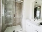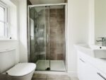 This contemporary en-suite is fitted with a low level WC, vanity unit with a bowl style handwash basin with mixer tap and a double shower cubicle with a thermostatic mixer shower. Grey tiles adorn the walls in the shower area with coordinating tiles underfoot. Spotlights to the ceiling and a chrome heated towel radiator complete the room. A front facing obscure glazed window allows natural light to enter and a door leads to the bedroom.