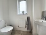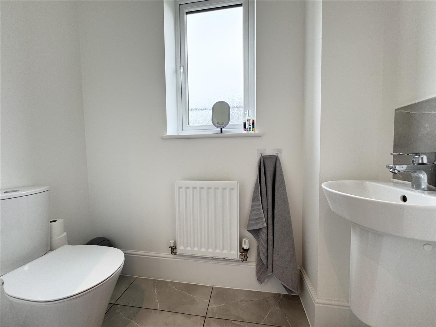 This handy downstairs WC is fitted with a two piece white suite including a low level WC and wall mounted hand wash basin with mixer tap. Grey marble effect tiles run underfoot. A rear facing obscure glazed windowallows natural light to enter and a door leads to the utility room.
