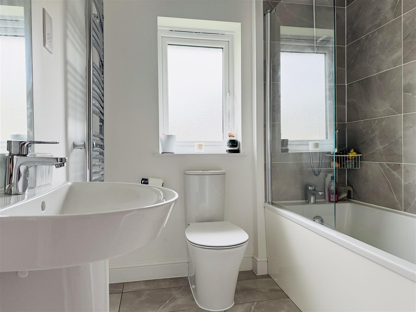 Fitted with a contemporary three piece white suite including a bath with shower over and protective glass screen, a wall mounted hand wash basin with mixer tap and a low level W.C. The walls are partially tiled with grey decorative tiles and there are matching tiles to the floor. There are spotlights to the ceiling and a chrome heated towel radiator completes the scheme. A rear facing obscure glazed window allows natural light into the space and a door leads to the landing.