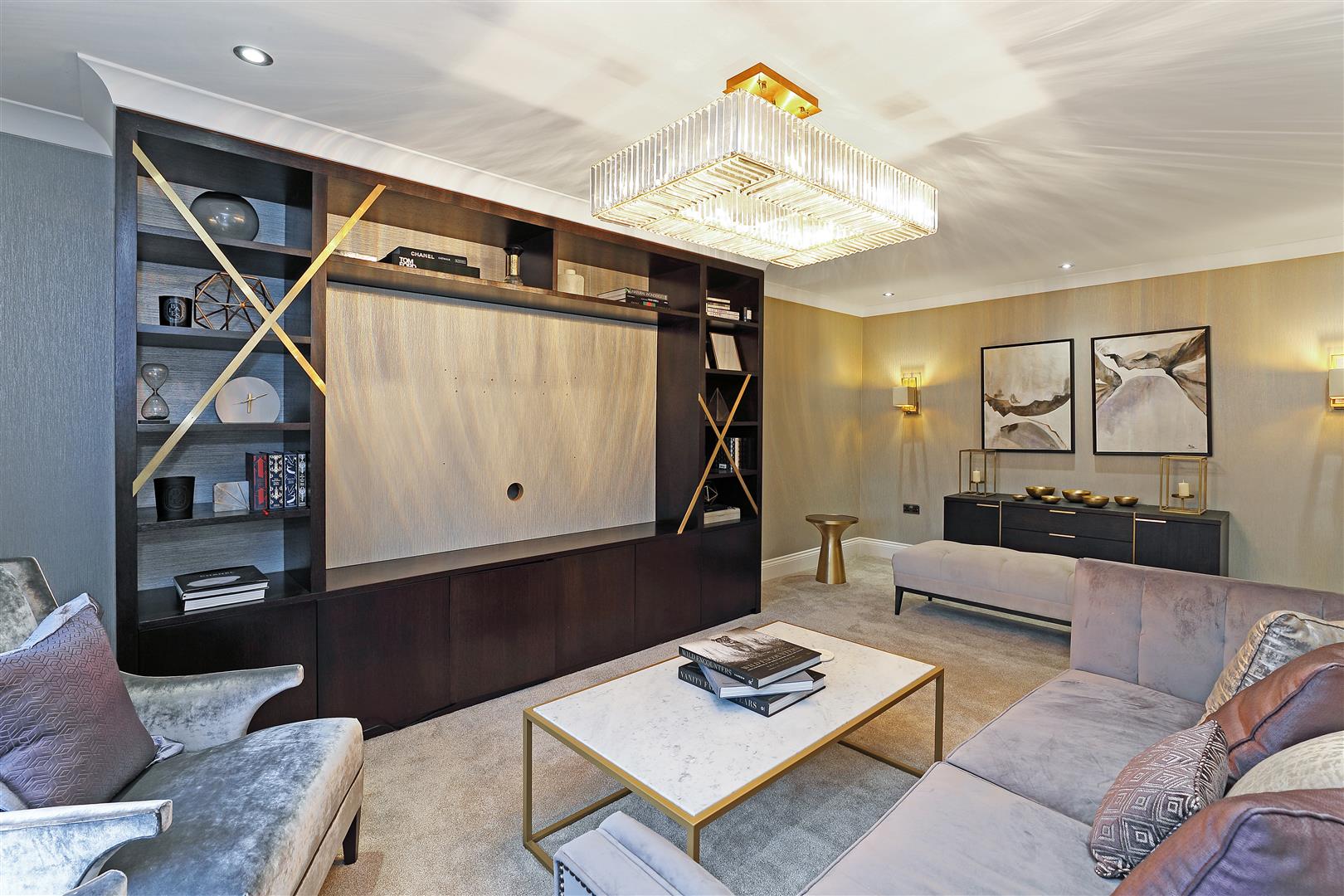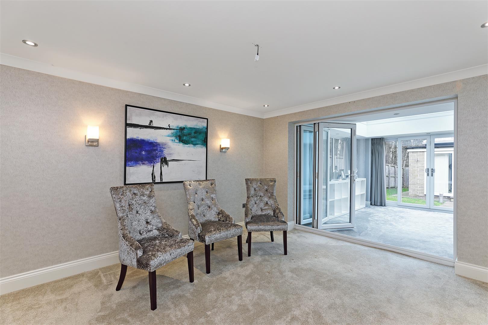 The dining room is spacious and refined, designed to flow into the attached orangery through bi-folding doors. The dining room is ideally suited for both everyday family meals and formal entertaining. With designer wallpaper and carpet underfoot, doors lead to the entrance hall.
