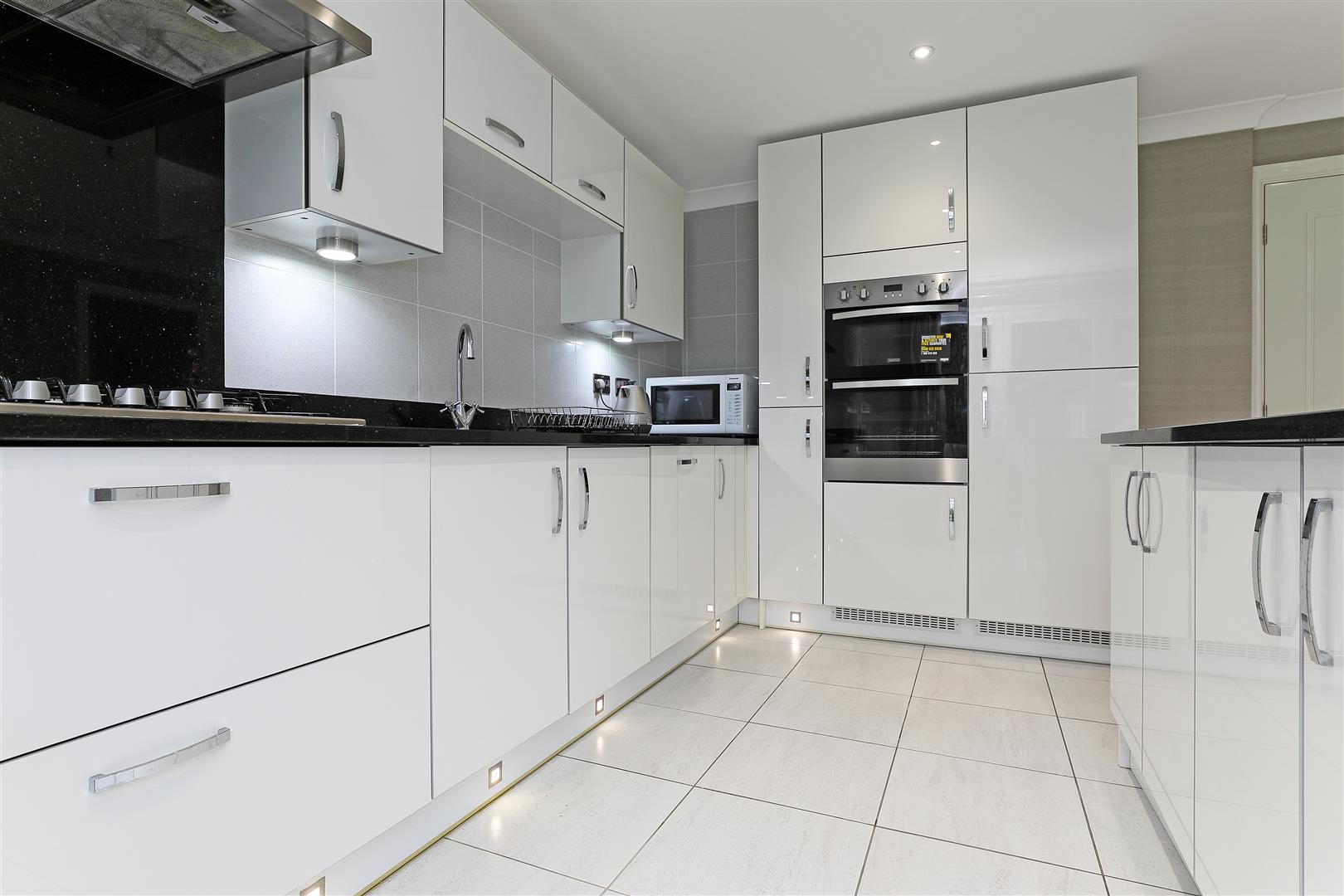 Positioned to the rear of the property with bi folding doors opening onto the garden, the kitchen has a good range of wall and base units with a gloss white finish, complimentary granite worktops with inset one and a half bowl stainless steel sink, mixer tap and matching granite splashbacks. Integral appliances come in the form of double electric oven, five ring gas hob with stainless steel extractor hood over, upright fridge freezer and dishwasher. The kitchen island provides storage and seating for casual dining. There is a combination of spot lighting and plinth lighting alongside tiled flooring underfoot. The kitchen includes an under stairs pantry, fitted with shelving, which provides storage for small appliances, and kitchen essentials. Doors lead into the utility and hallway.