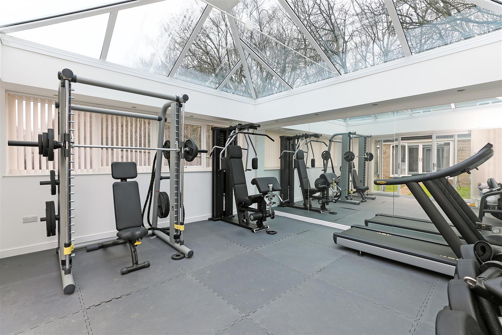 This fabulous stone-built garden room has been used as a gym by the current vendors but would also make a wonderful space for a small business, teenage den or impressive entertaining space. There is glazing to three sides and a roof lantern, filling the room with natural light. Spot lighting is fitted to the ceiling, there is power, rubber mat flooring and sliding patio doors opening onto the garden.