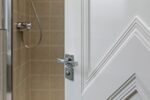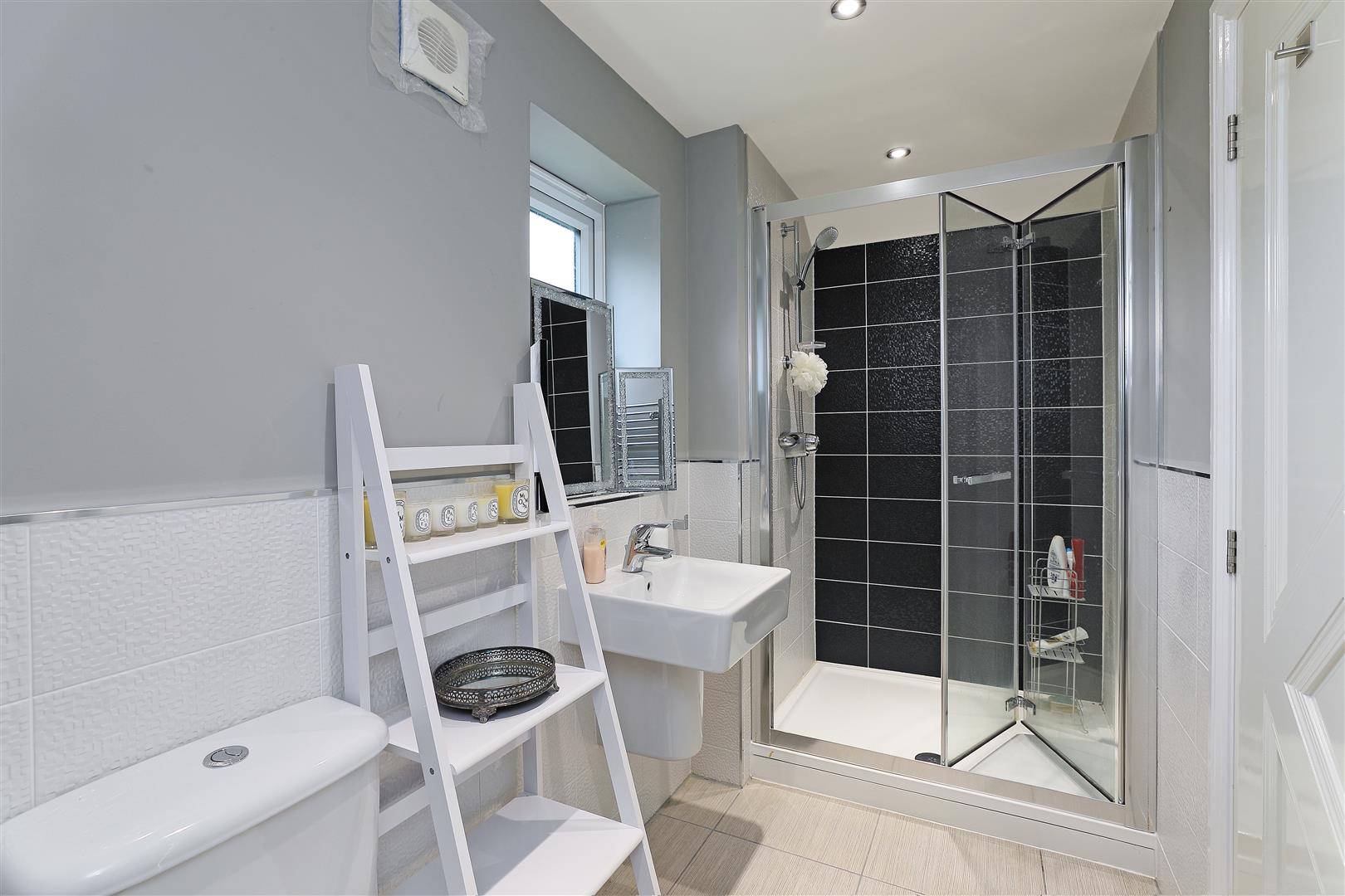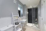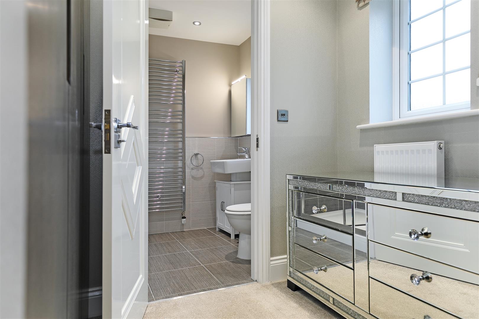Similar to the second en-suite, this includes a three-piece white suite with double shower cubicle, mains-fed shower and bi-folding glazed door, a wall-hung hand wash basin with mixer tap and low-level W.C. The walls are partially tiled, there are spotlights to the ceiling, a side-facing obscure-glazed window, chrome heated towel rail and complementing tiled flooring. A door leads to bedroom three.
