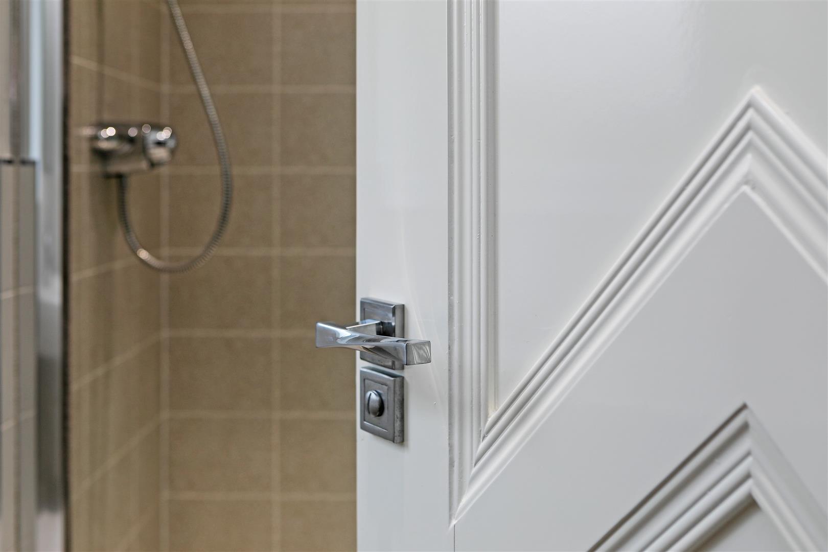 Comprising a modern three-piece white suite including a double shower cubicle with mains-fed shower and bi-folding glazed door, a wall-hung hand wash basin with mixer tap and low-level W.C. This en-suite is partially tiled in decorative wall tiles in two neutral tones. There are spotlights to the ceiling, a chrome tall heated towel rail, an obscure-glazed front-facing window and tiled flooring. A door leads to the dressing area.
