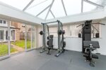 Gated side access leads to the rear garden which is mainly laid to lawn, with a flagged patio area and path wrapping around the property to the built-in storage and continuing down to the gym/garden room.