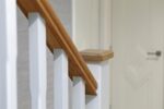 Stairs rise from the first-floor landing to the second-floor landing, where there is a small access door into the eaves space and a door opening to the top-floor suite.