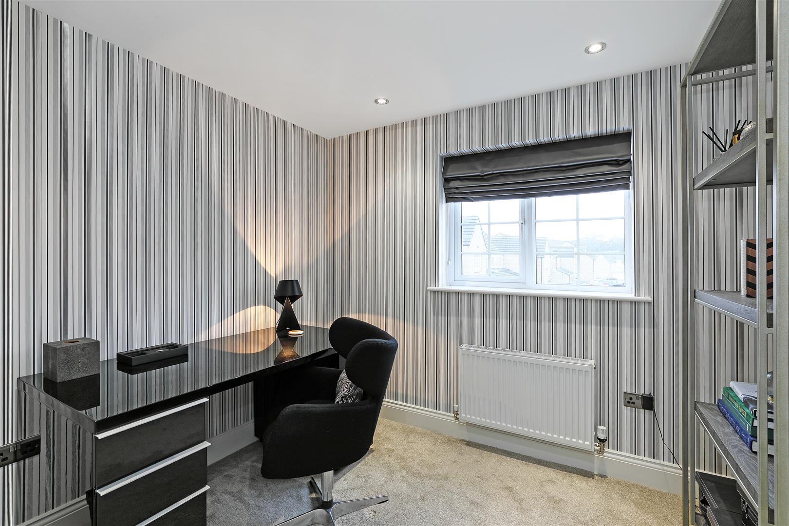 Extremely practical for modern-day living, this home office is ideal for those working from home or for children needing separate study space. The room can easily accommodate a desk, chair and storage, and benefits from additional built-in shelved storage to one corner. If an office were not required, this would make a lovely hobby room or sixth bedroom. There is spot lighting, a front-facing window and a door leading to the landing.