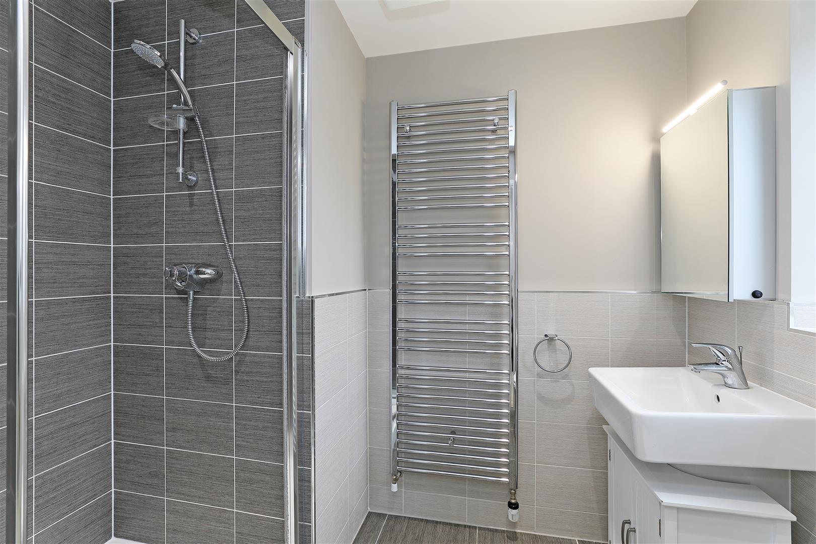 Fitted with a double shower cubicle with mains-fed shower and bi-folding glazed door, a wall-hung hand wash basin with mixer tap and low-level W.C. This bright en-suite is partially tiled in contrasting-tone wall tiles and has complementing floor tiles. The room offers space for freestanding storage, has spot lighting, a side-facing obscure-glazed window, a chrome heated towel rail and a door leading to the sitting area.