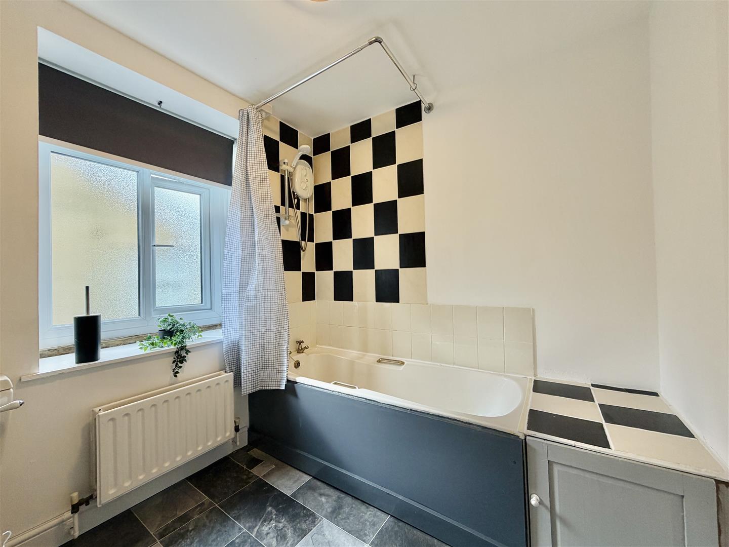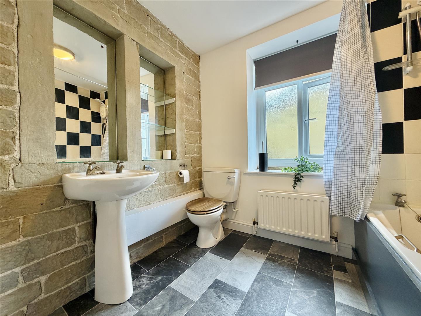 This good sized bathroom has a three piece suite consisting of a low level w.c, a pedestal wash hand basin and a bath with a shower over. The original features of the flat continue in here with exposed stonework showing the former window opening, a good sized timber framed window and a central heating radiator.