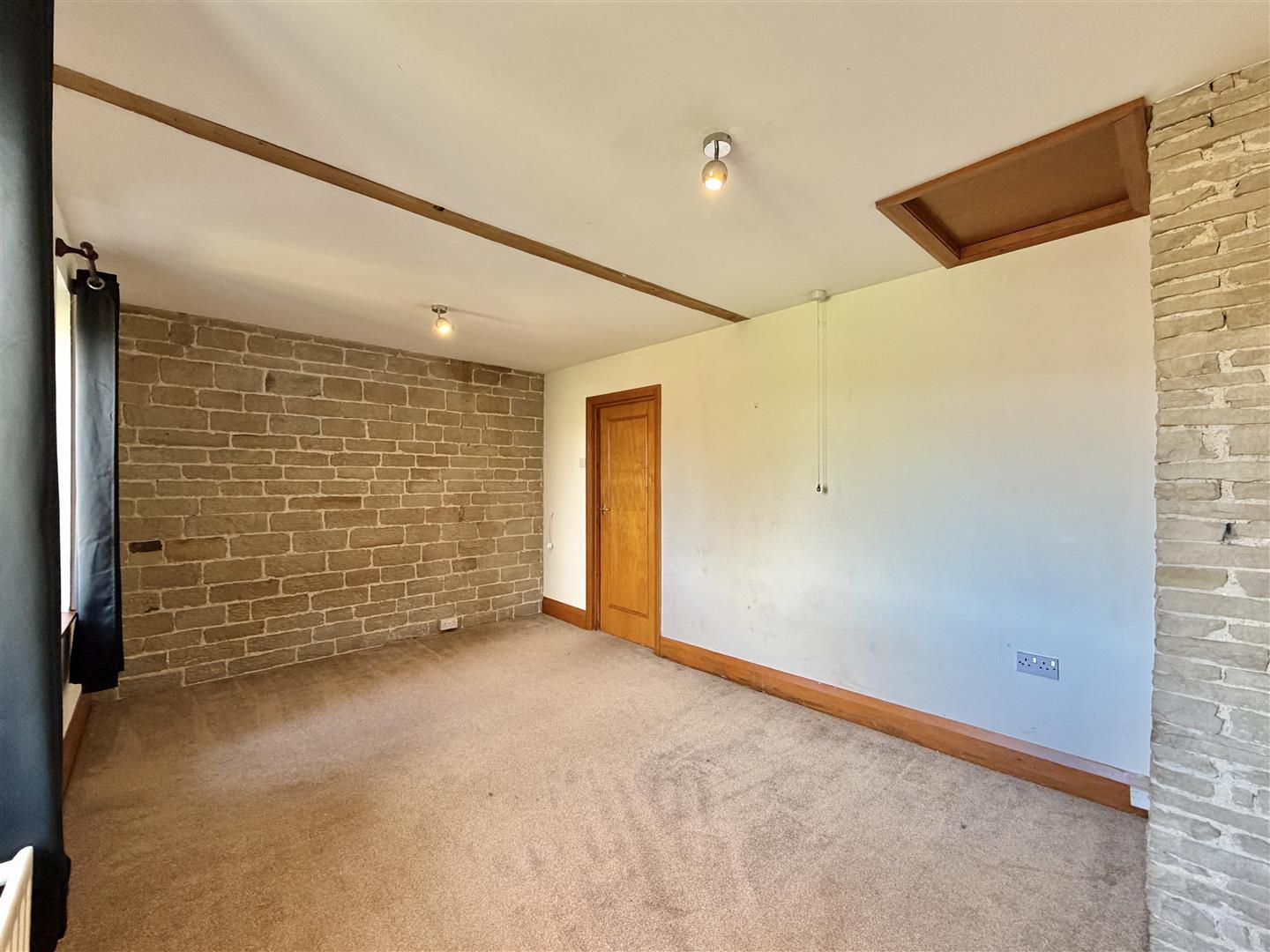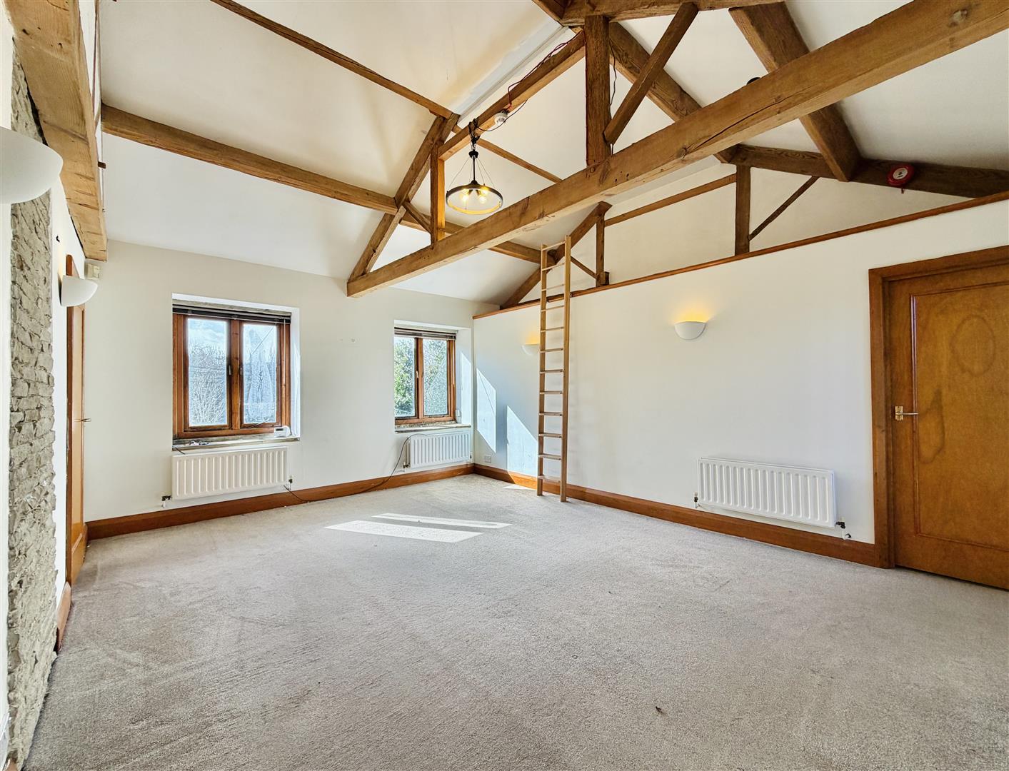 This good sized room has plenty of space for free standing living room furniture and could easily accommodate a dining set if required. This intriguing space has a vaulted ceiling with roof trusses, exposed beams and exposed stonework highlighting the buildings original construction. The room is flooded with an abundance of natural light from the dual aspect windows, which offer far reaching views over the surrounding countryside and beyond.