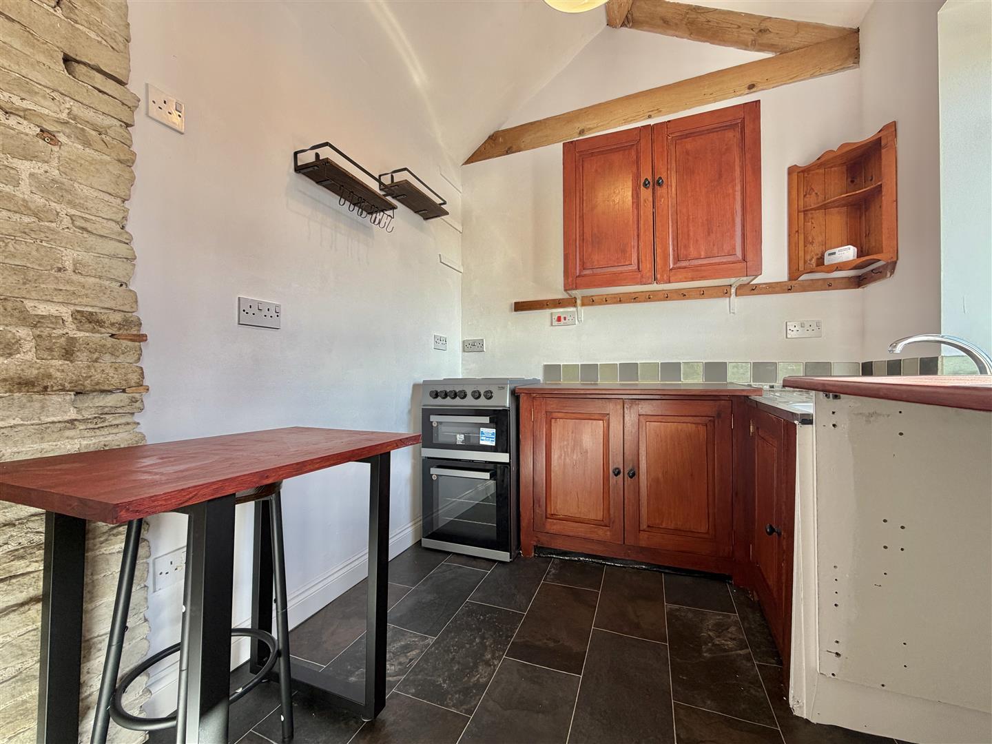 This quaint kitchen has timber wall and base units and a rolltop worksurface adjacent to a stainless steel sink and drainer. The is an electric cooker point, plumbing for a washer machine and the properties central heating boiler is located here. The room has a good sized timber window, neutral decor, pendant lighting and exposed timber work.