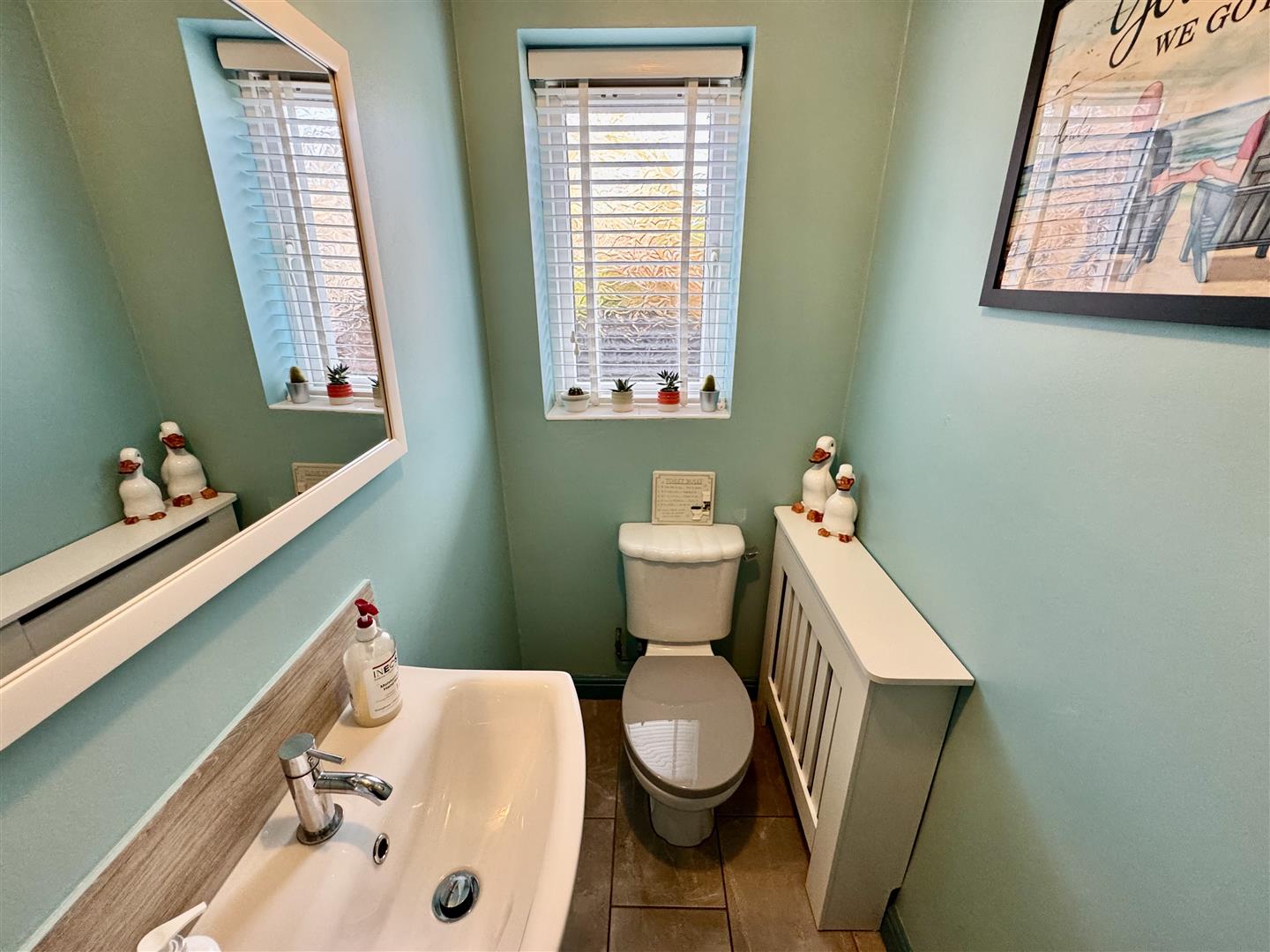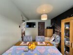 This handy W.C is fitted with a white suite comprising of a low level toilet and a vanity hand wash basin with mixer tap. The floor is finished with contrasting tiles, there is a side facing obscure glazed window and a door leads to the dining kitchen.