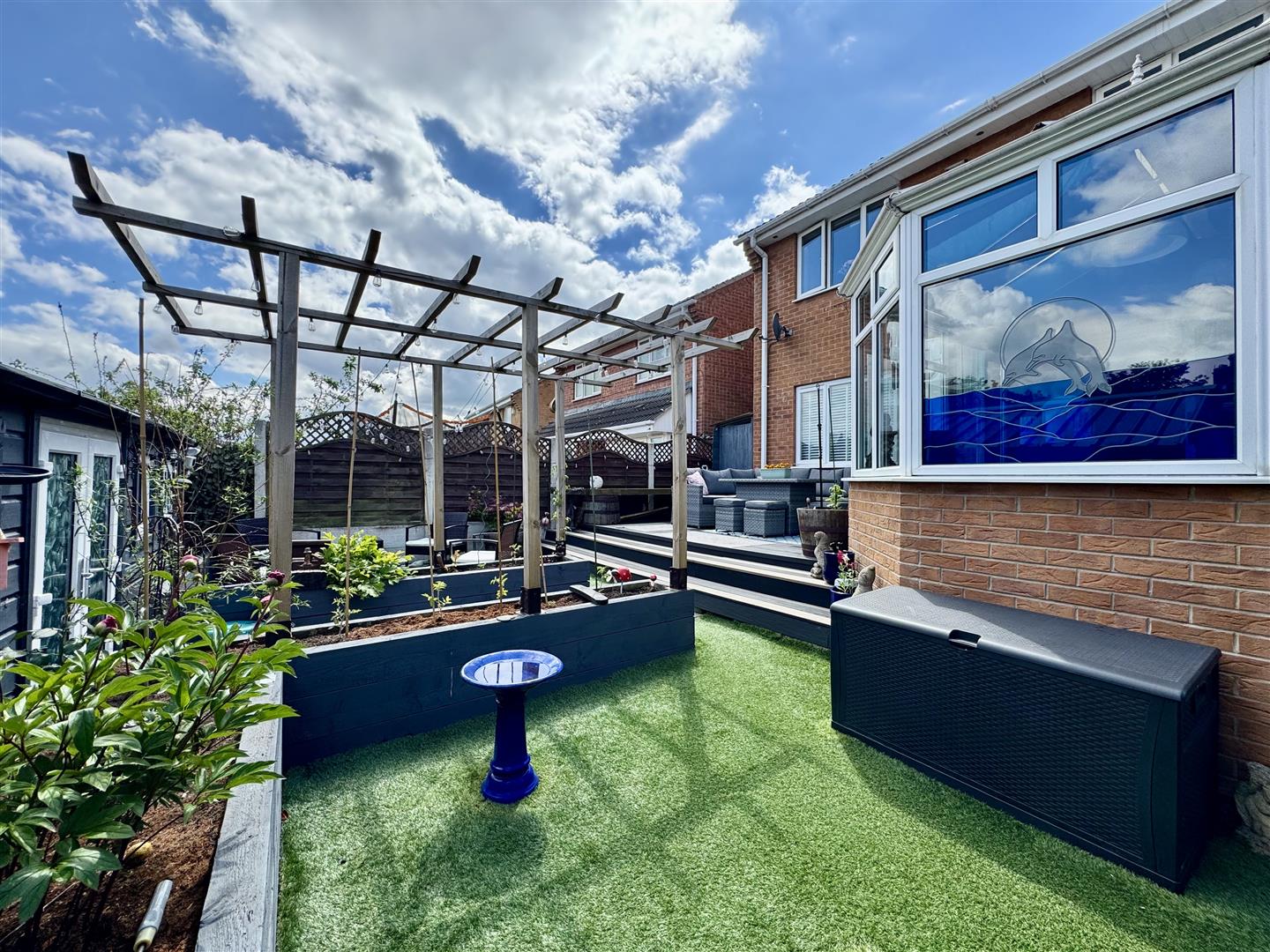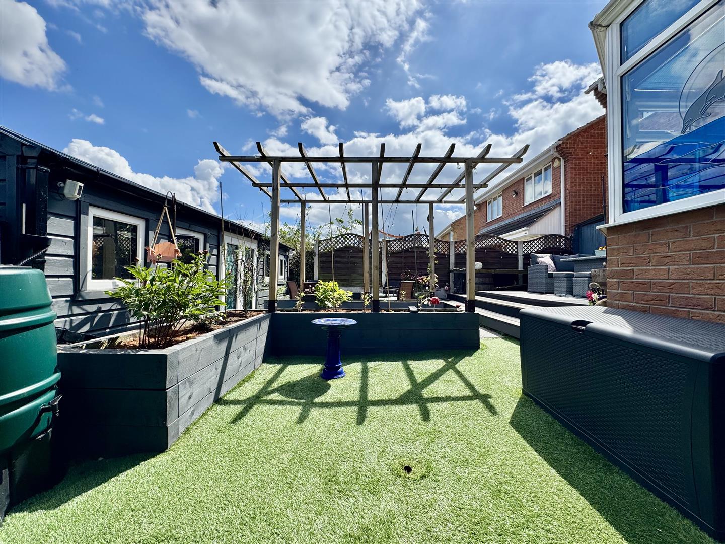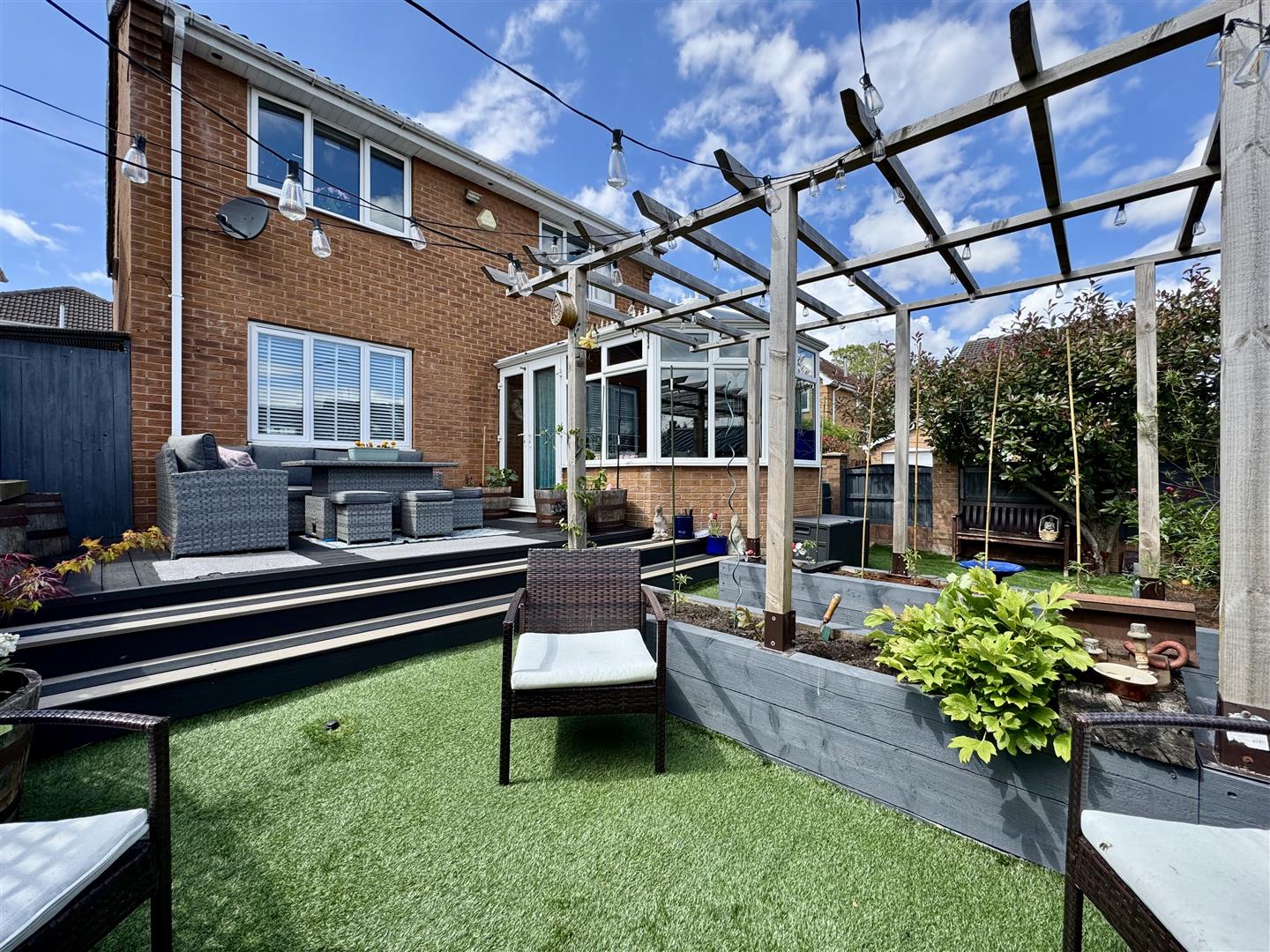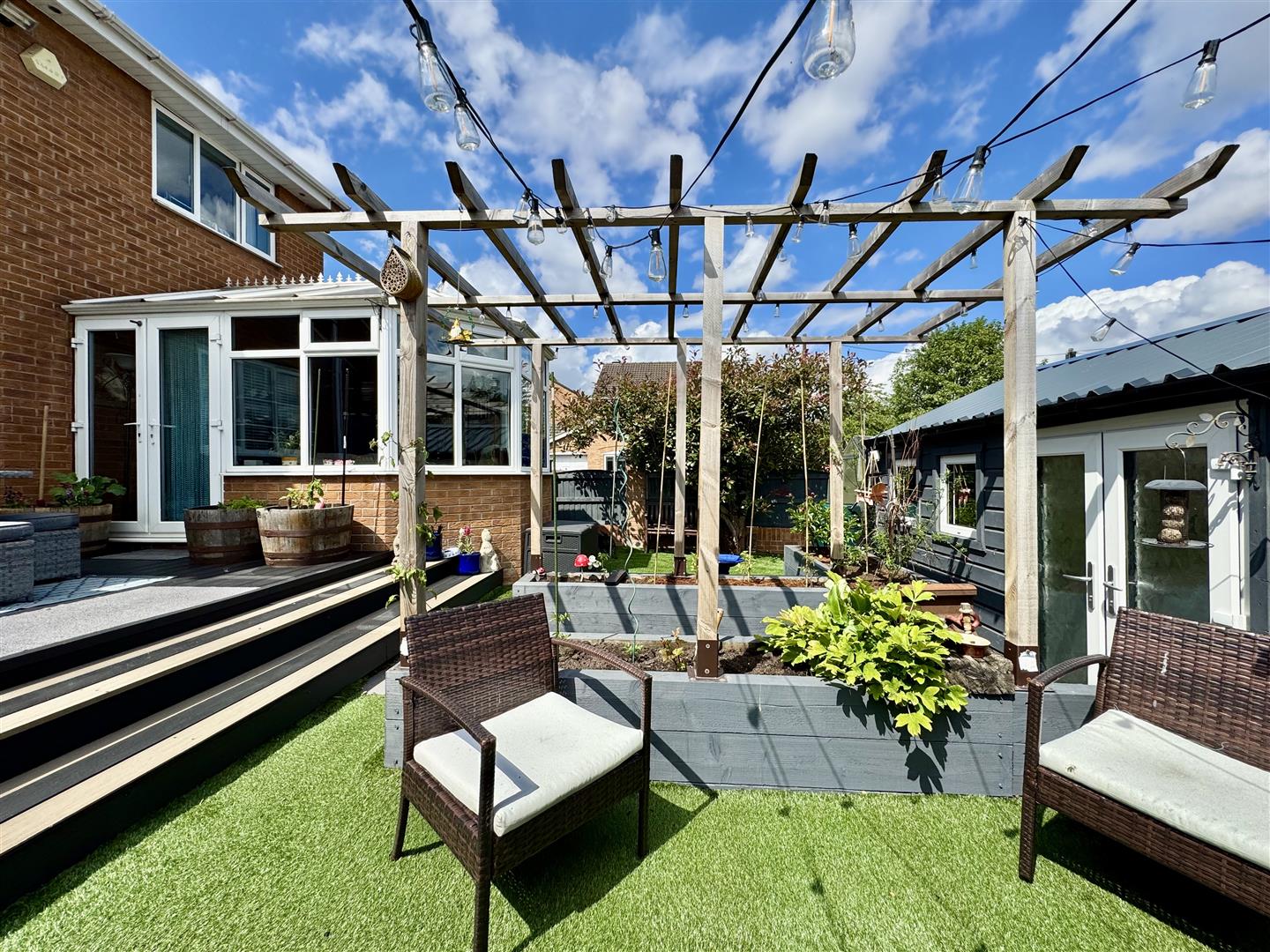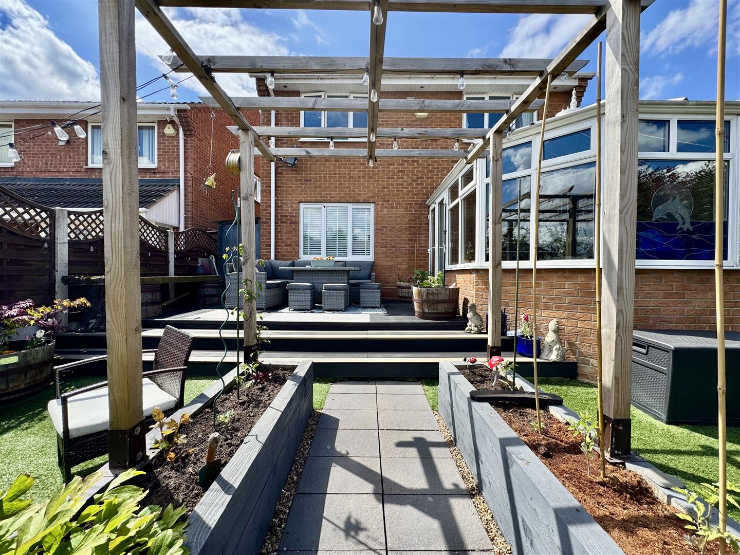 A fence enclosed and wonderfully landscaped rear garden which has a range of spaces to enjoy. A raised composite deck allows space for outdoor dining, room for garden furniture and offers lovely views over the garden and far reaching views beyond. Steps lead down to a low maintenance artificial lawn which has raised timber flower beds ideal for growing plants, shrubs and vegetables if desired. A pathway leads under a pergola to the summer house and a Red Robin Tree gives a lovely focal point. There is space for a greenhouse and a pathway with a timber gate leads to the front of the property.