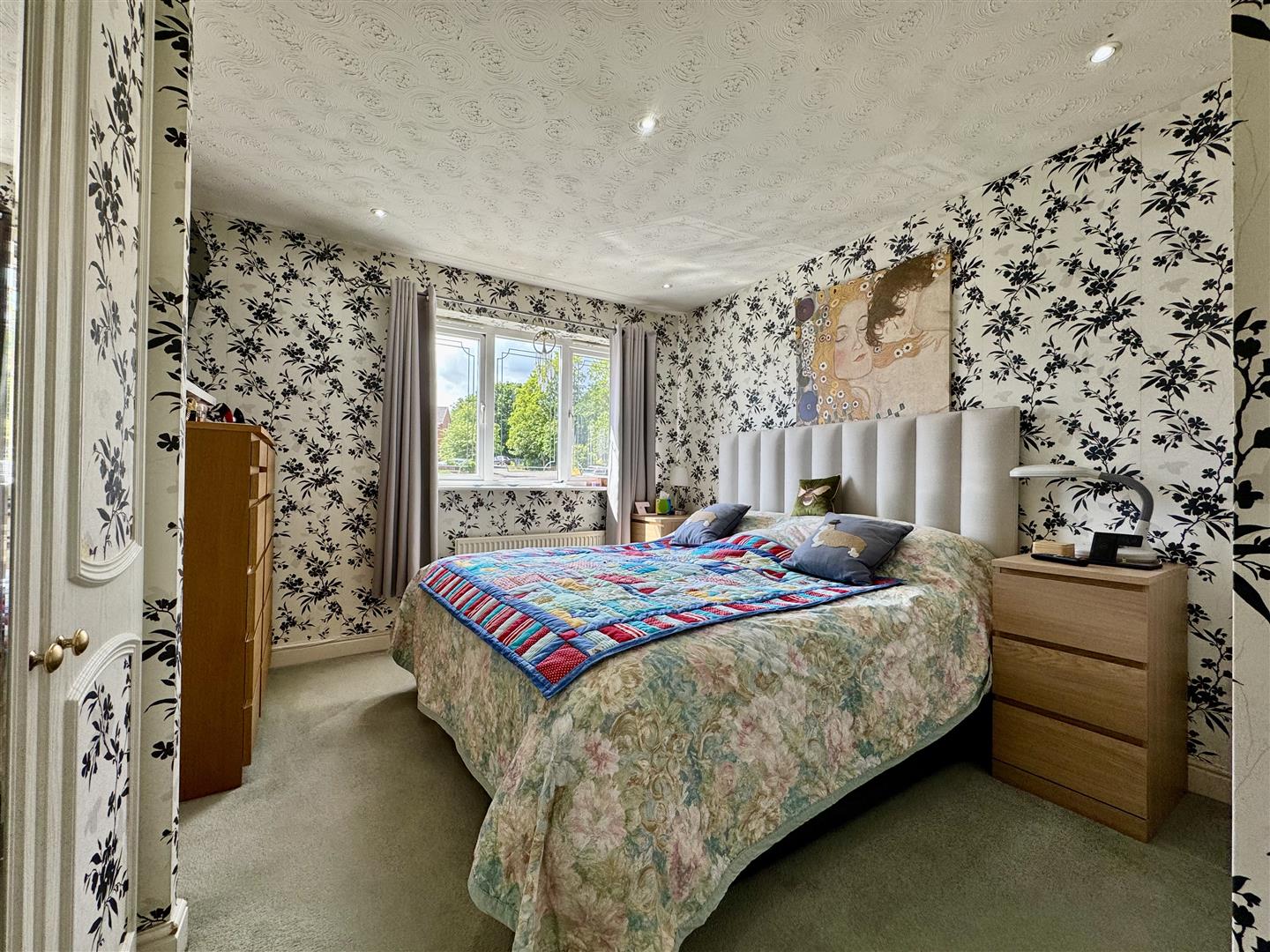 A neutrally decorated double bedroom with views over the garden below with fitted shelving, space for freestanding furniture and a door leads to the landing.