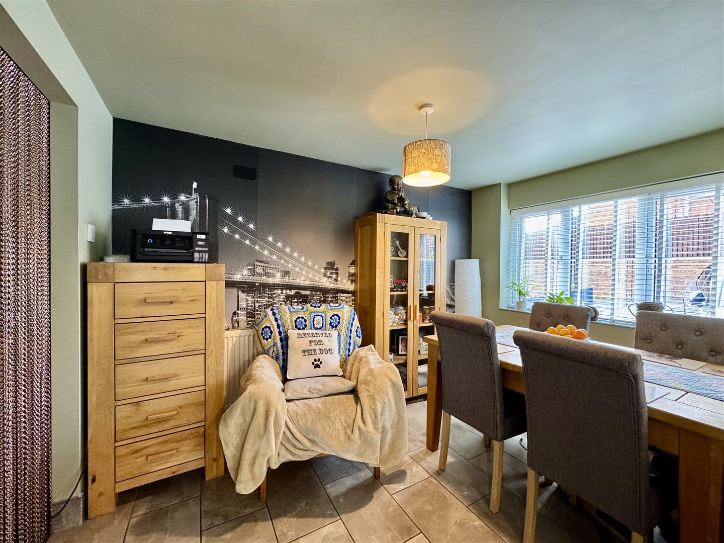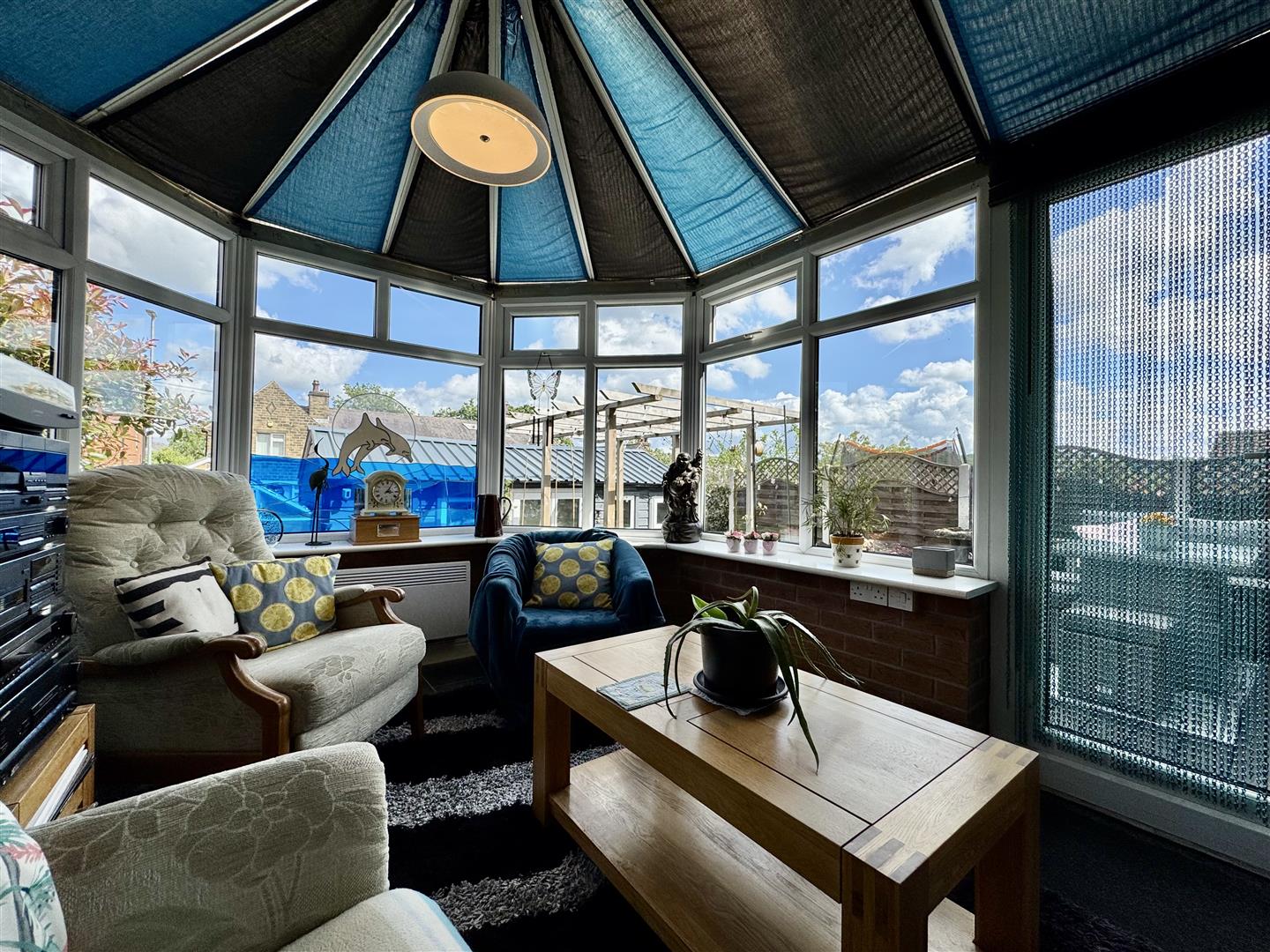 Flooded with natural light and with fantastic views out to the garden, this room has space for freestanding furniture, tile flooring underfoot and patio doors open to the gardens raised decking.