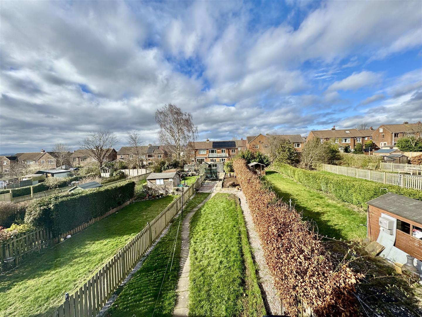 This impressive size garden is hedge and fence enclosed and offers a range of spaces to enjoy. Adjacent to the property is a patio ideal for outdoor dining, a lawn with ample space for garden furniture and to the rear are decorative shale and raised flower beds and a good size paved area for timber outbuildings if desired.