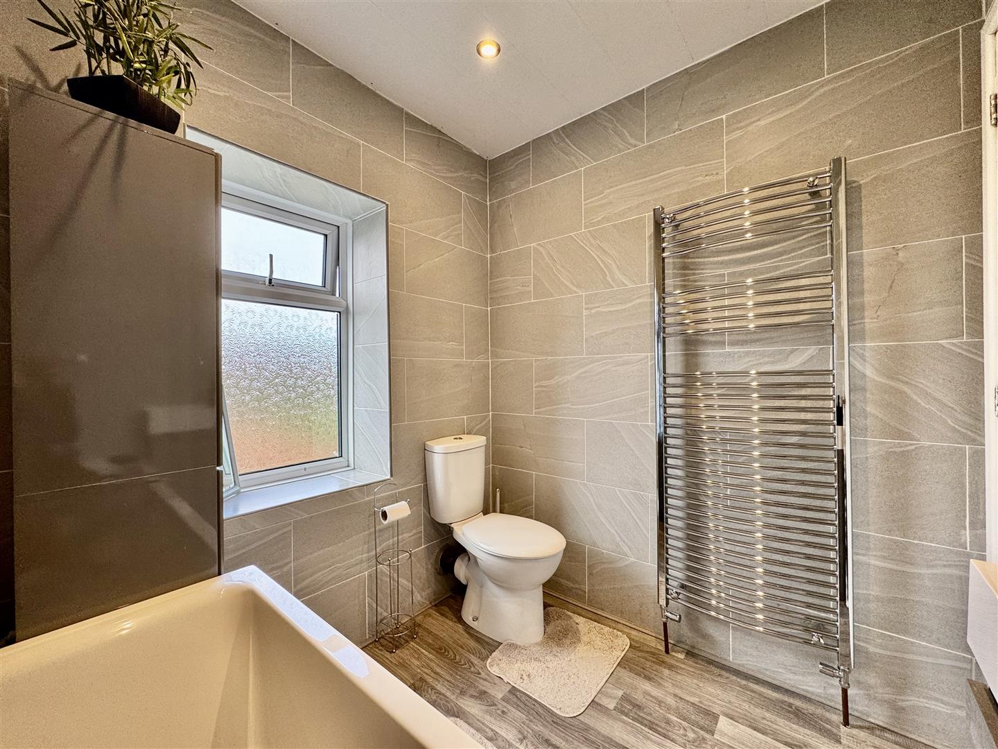 This attractive bathroom is fitted with a white three-piece suite, including a bath with shower attachment over, vanity hand wash basin with mixer tap, a low level W.C and a chrome towel radiator. The room is fully tiled with complimentary laminate flooring underfoot. A rear obscure window allows light to flow through and a door leads through to the landing.